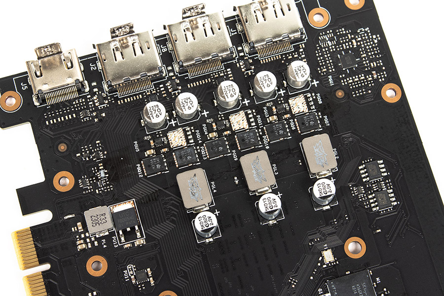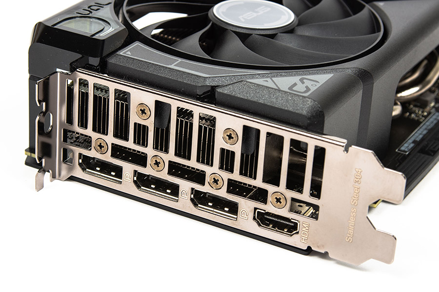 На інтерфейсній планці є три роз’єми DisplayPort 1.4a та один HDMI 2.1a. Також на ній присутні великі отвори для проходження повітря.