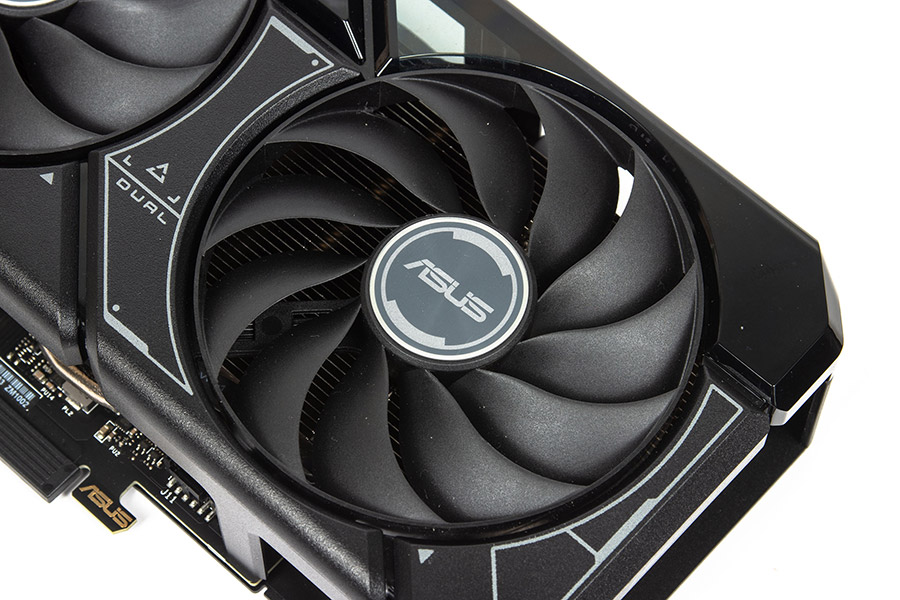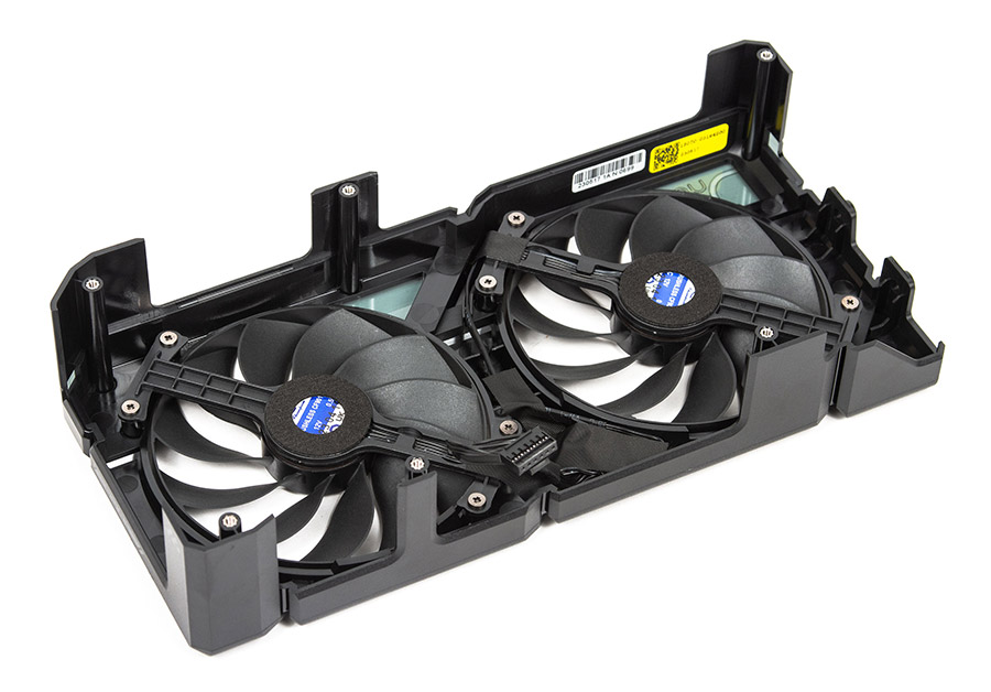 Для охолодження карти використовуються два 90-мм вентилятори ASUS Axial-tech товщиною близько 10 мм та з 11 сильно загнутими лопатями, які на кінцях об’єднані кільцем. В них встановлено дві кулькові вальниці, що повинно збільшити термін служби вентиляторів. Вони зупиняються після охолодження GPU до 50 градусів і в простої системи не працюють. При навантаженні вентилятори іноді розкручувалися до максимальних обертів, тож в деяких моментах в іграх їх вже можна було почути.