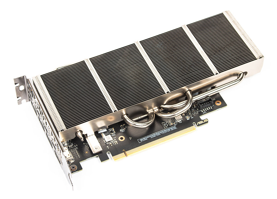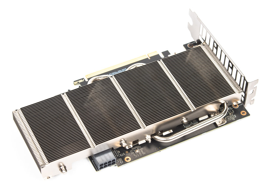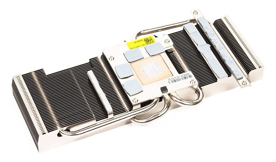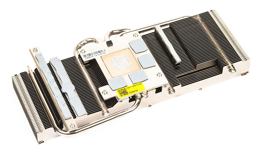 З GPU радіатор контактує через мідну п’ятку, тоді як для пам’яті передбачена окрема нікельована пластина, тепло до якої від чипів передається через тонкі термопрокладки. Ще дві пластинки знаходяться напроти силових елементів, є також зона контакту зі звичайними ребрами. Використовуються товсті термопрокладки, крім зони з ребрами, де розміщена тонка прокладка.