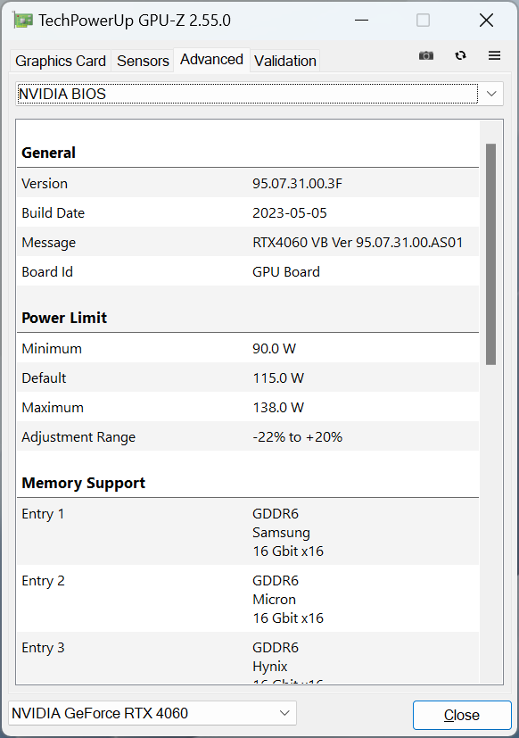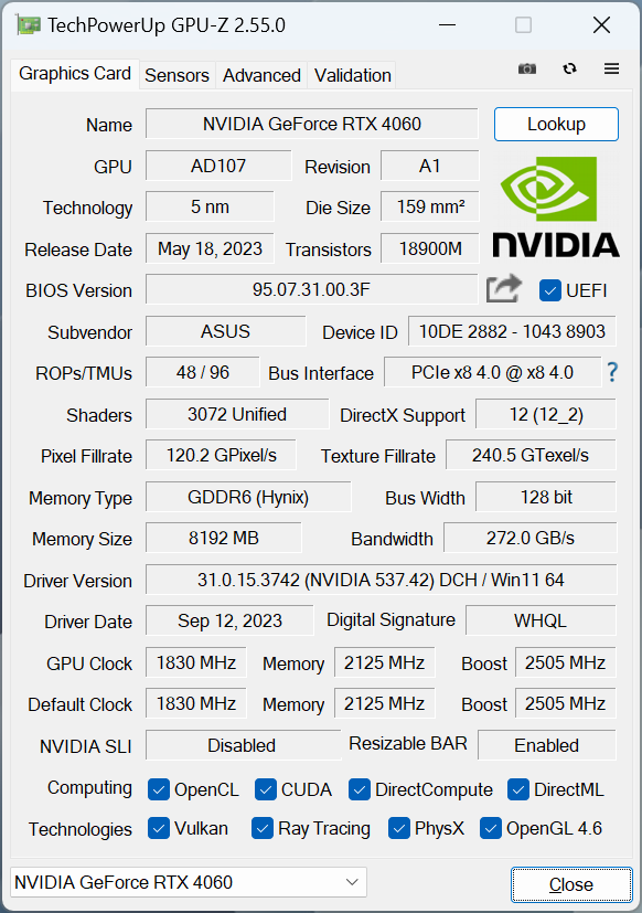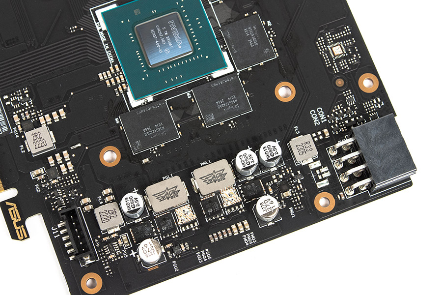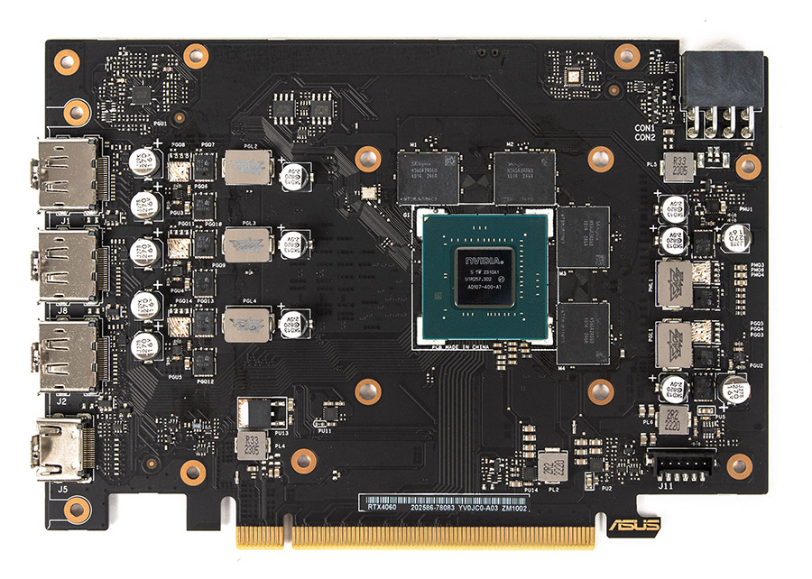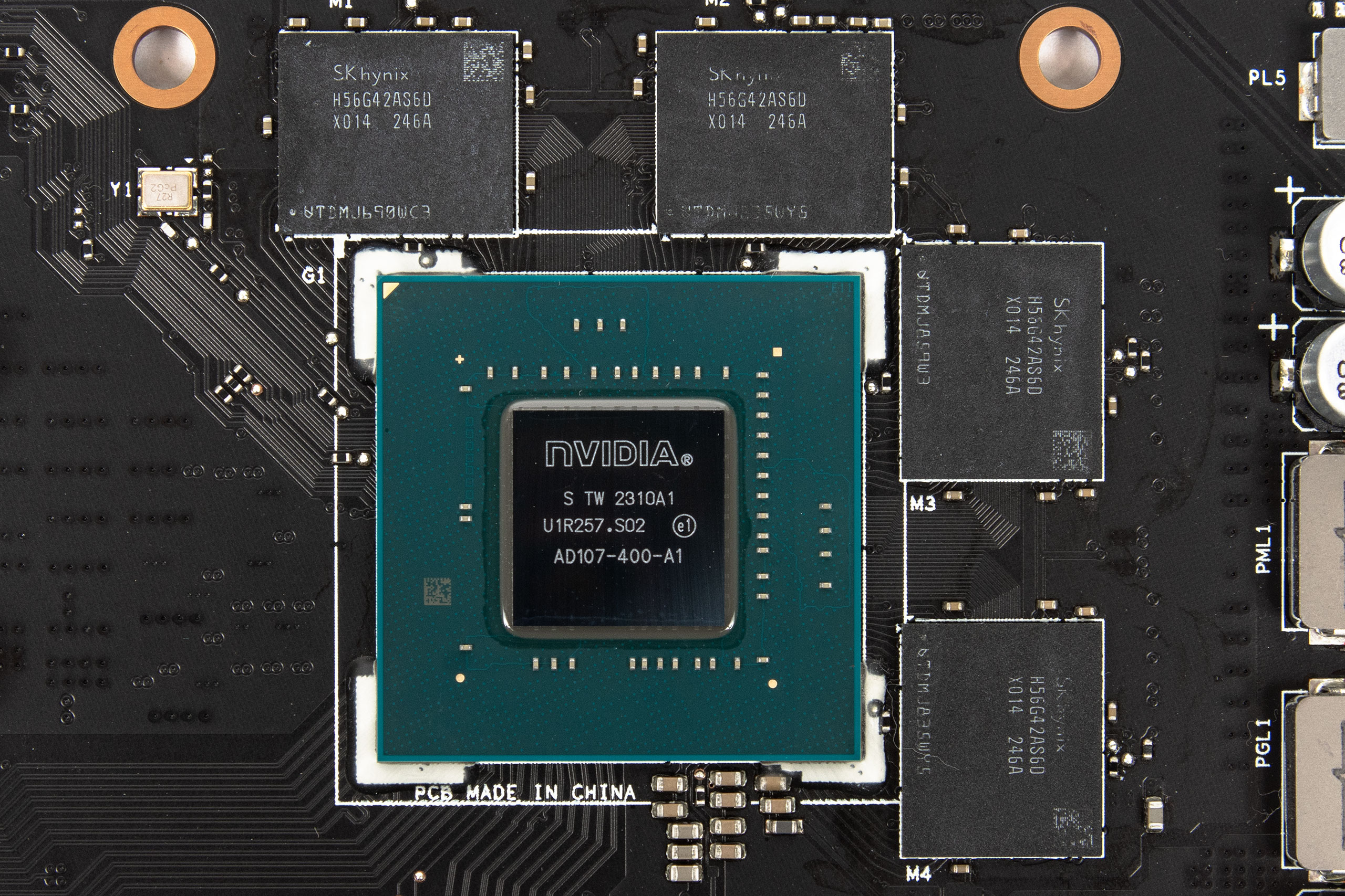 Чип AD107-400-A1 має квадратну форму та не оснащений захисною рамкою. Він взаємодіє з мікросхемами пам’яті SK Hynix H56G42AS6DX-014 з загальним обсягом 8 ГБ через 128-бітну шину.