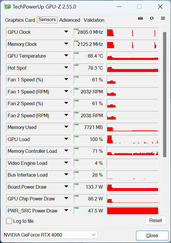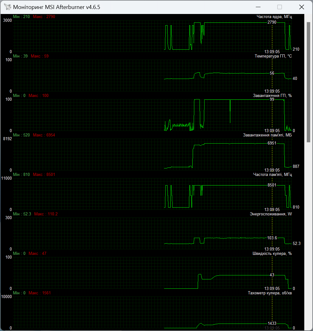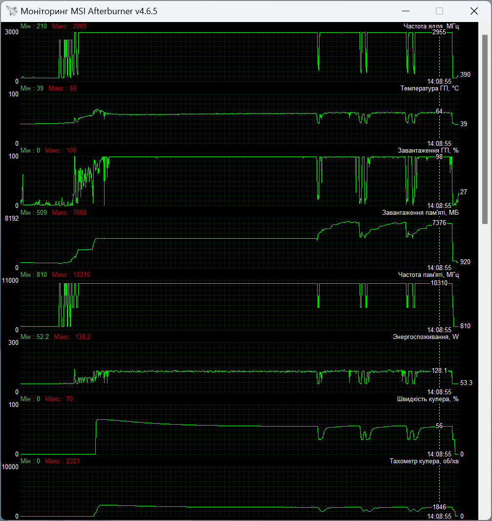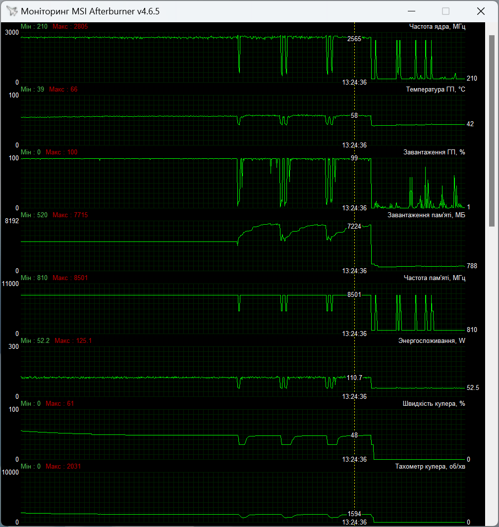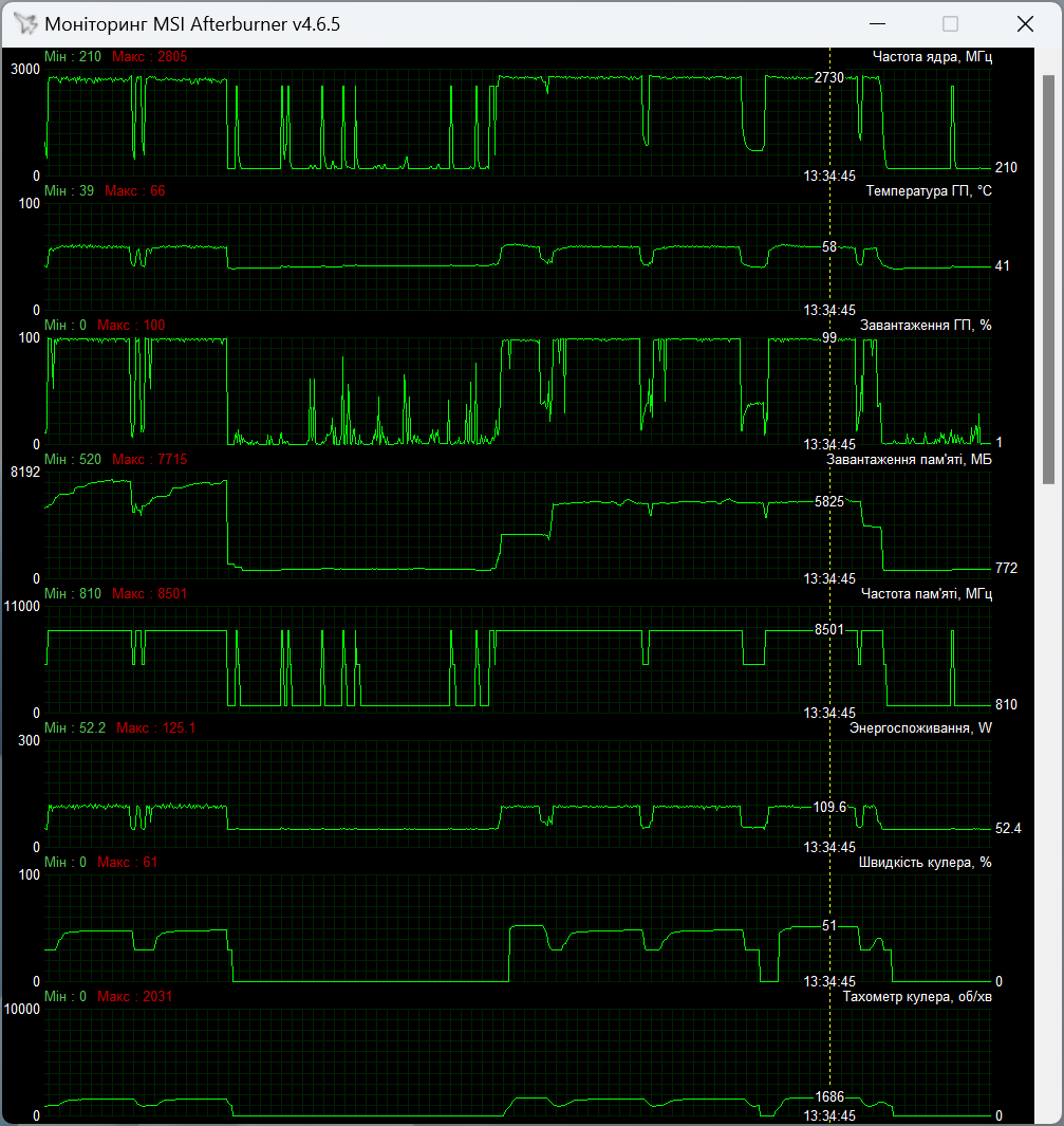 Чип нагрівався до 66 градусів (Hot Spot 78 °C), а швидкість вентиляторів сягала 2038 об/хв.