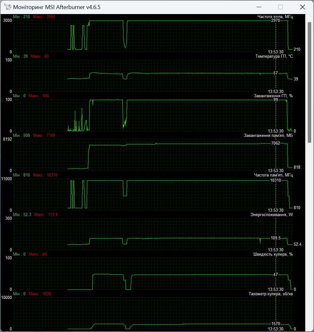 З такими налаштуваннями частота графічного процесора у більшості випадків доходила до 2955 МГц, хоча в деяких іграх могла сягати й 2970 МГц.