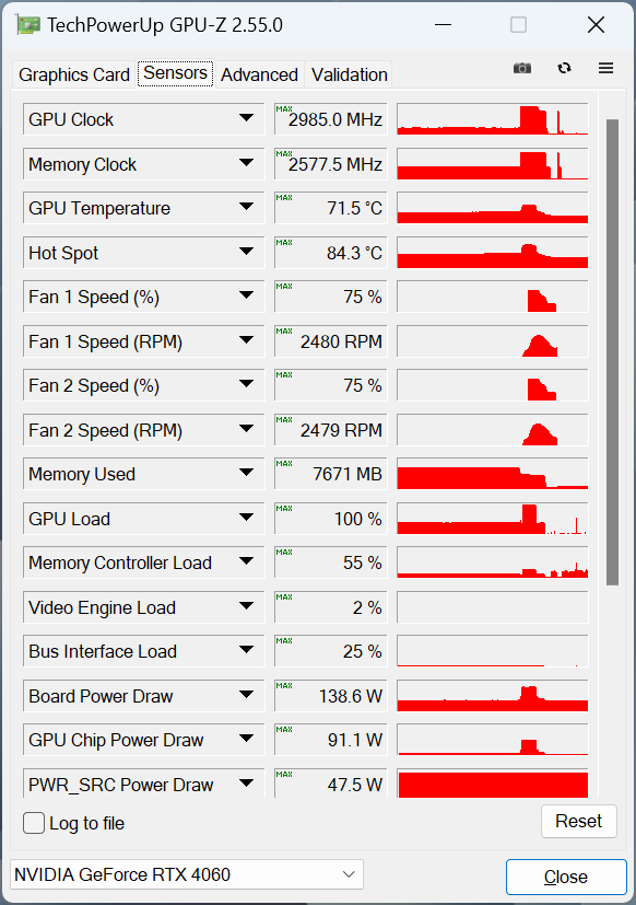 У такому режимі температура GPU була вже 71,5 градуса (Hot Spot 84 °C), а вентилятори розкручувалися до майже 2500 об/хв.