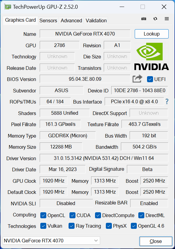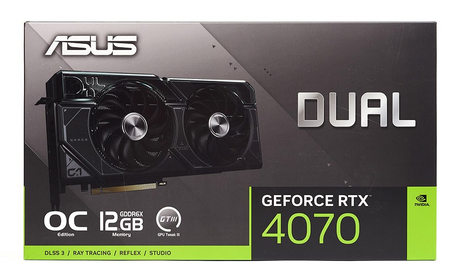 Графічний процесор карти ASUS Dual GeForce RTX 4070 OC Edition 12GB працює на частоті 1920 МГц з автоматичним прискоренням до 2520 МГц. Пам’ять функціонує зі швидкодією 21 ГТ/с.
