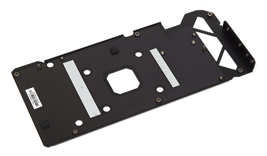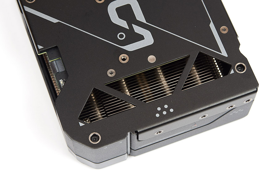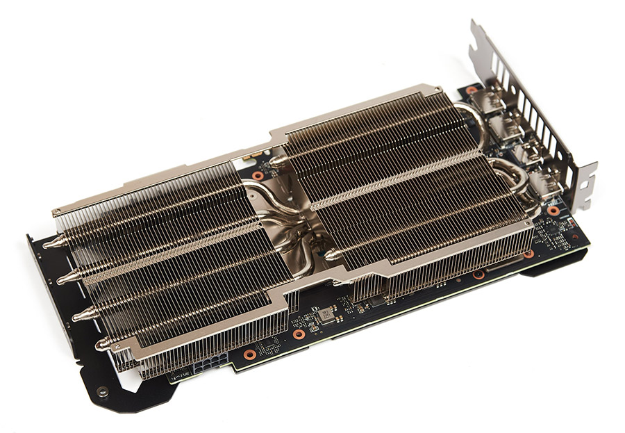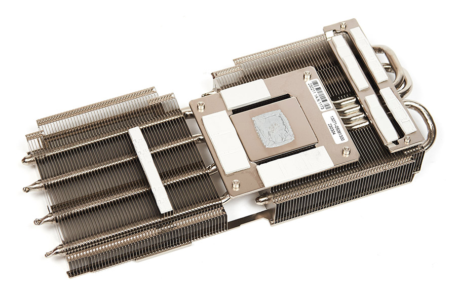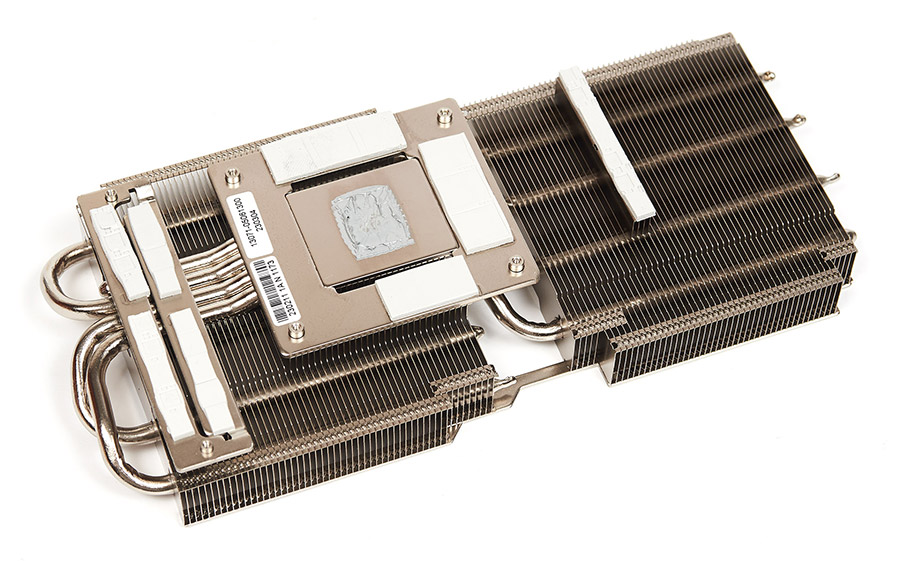 Радіатор виконаний з двох секцій тонких алюмінієвих пластин, які пронизують чотири мідних теплових трубки. Вони напаяні на тонкий мідний п’ятак, який контактує з графічним процесором. Також трубки проходять через металеву рамку, яка охолоджує пам’ять через товсті термопрокладки. Є ще пластинки для охолодження силових елементів.