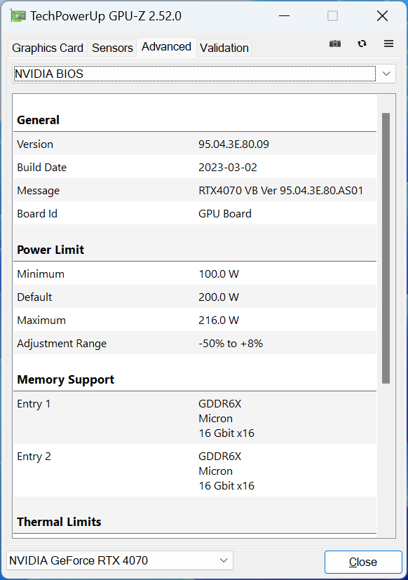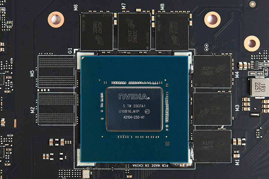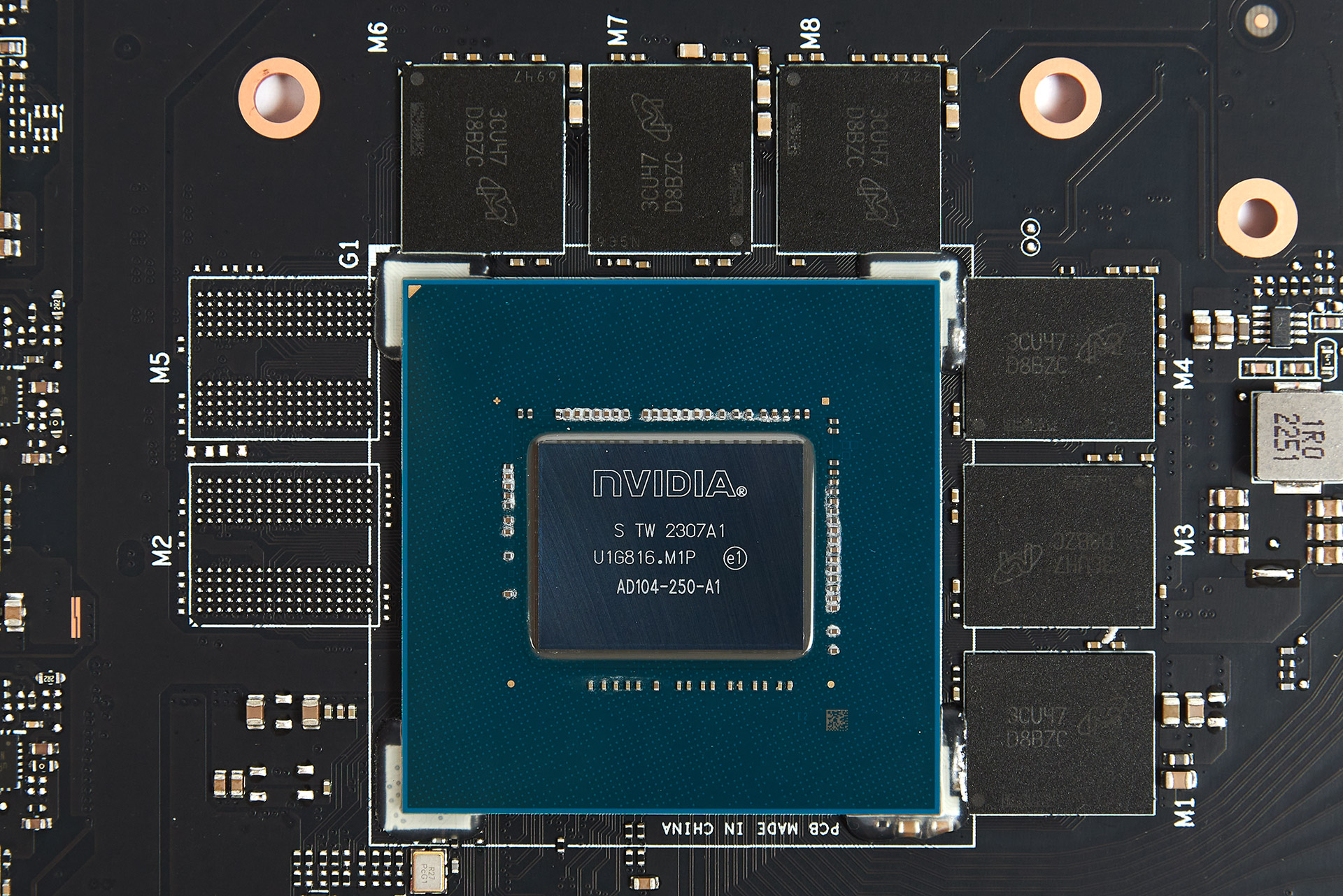 Чип AD104-250-A1 такий же довгастий, як й у карти GeForce RTX 4070 Ti, він розвернутий відносно плати. Захисної рамки, яку можна зустріти в старших моделях серії RTX 40, тут немає. Пам’ять Micron 3CU47D8BZC з загальним обсягом 12 ГБ взаємодіє з GPU через шину розрядністю 192 біти. Є вільне місце ще для двох мікросхем.