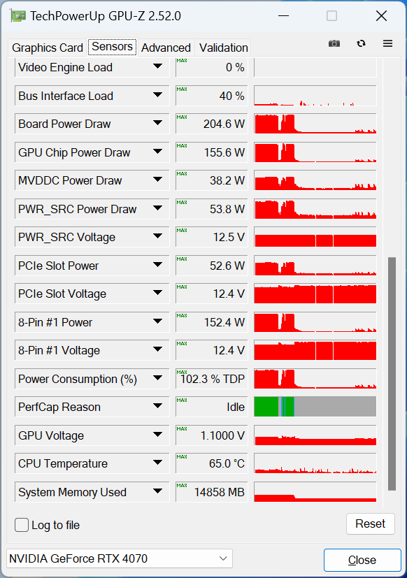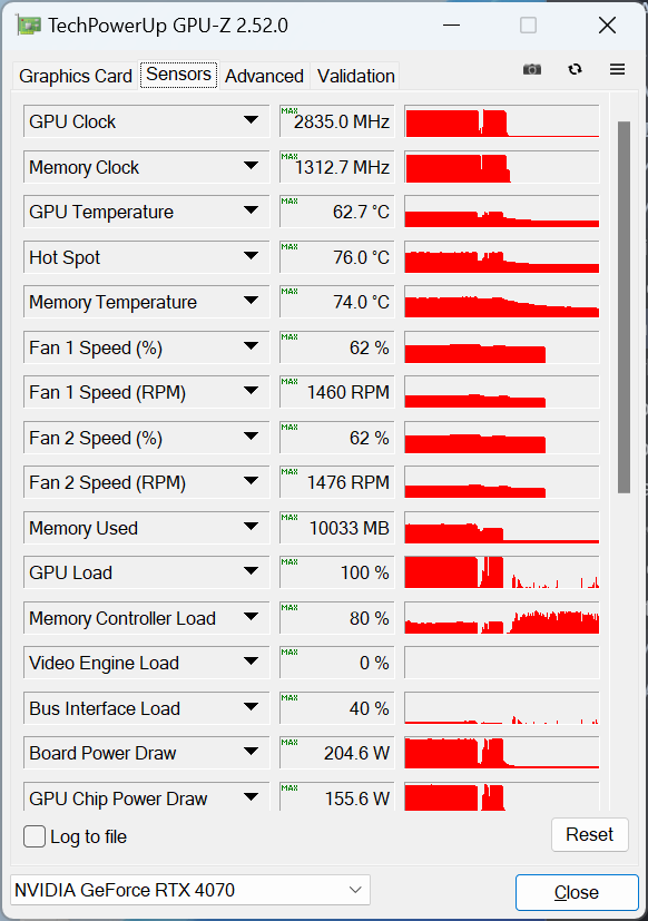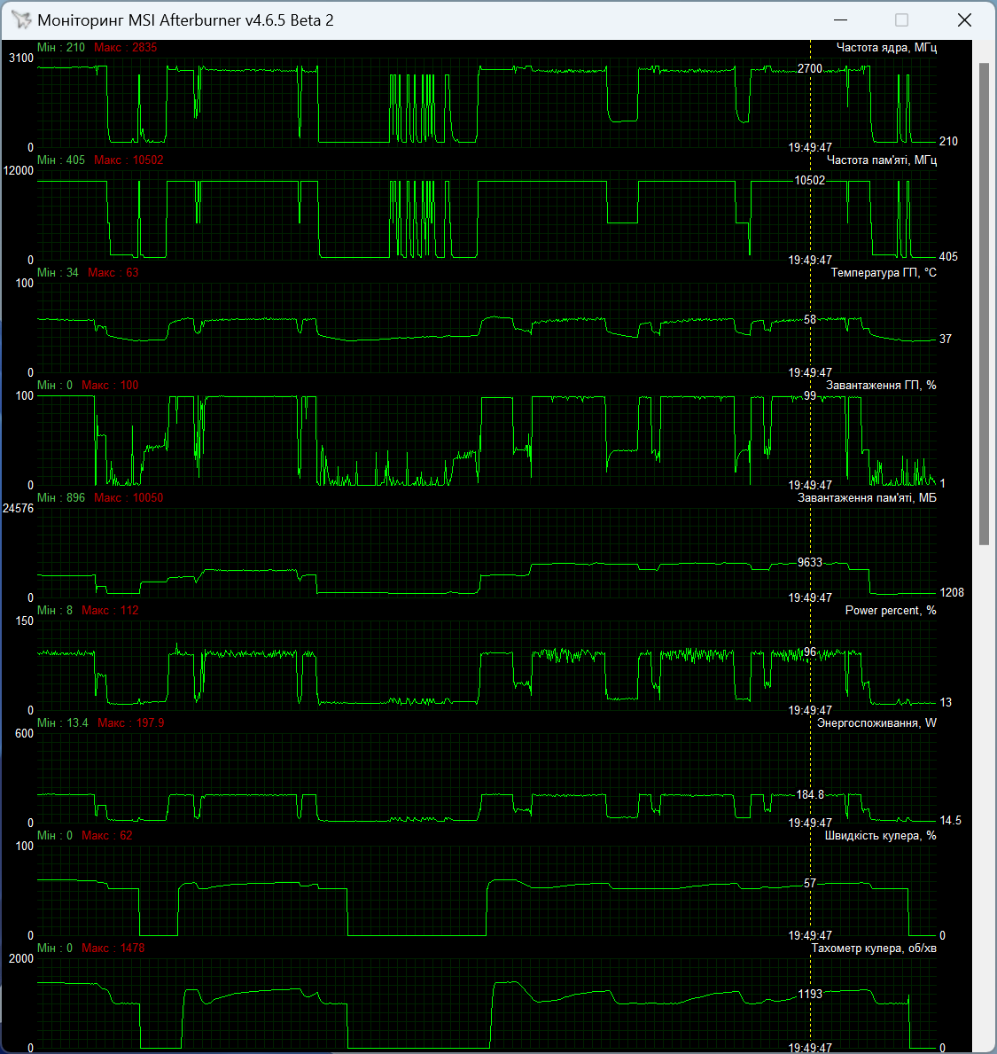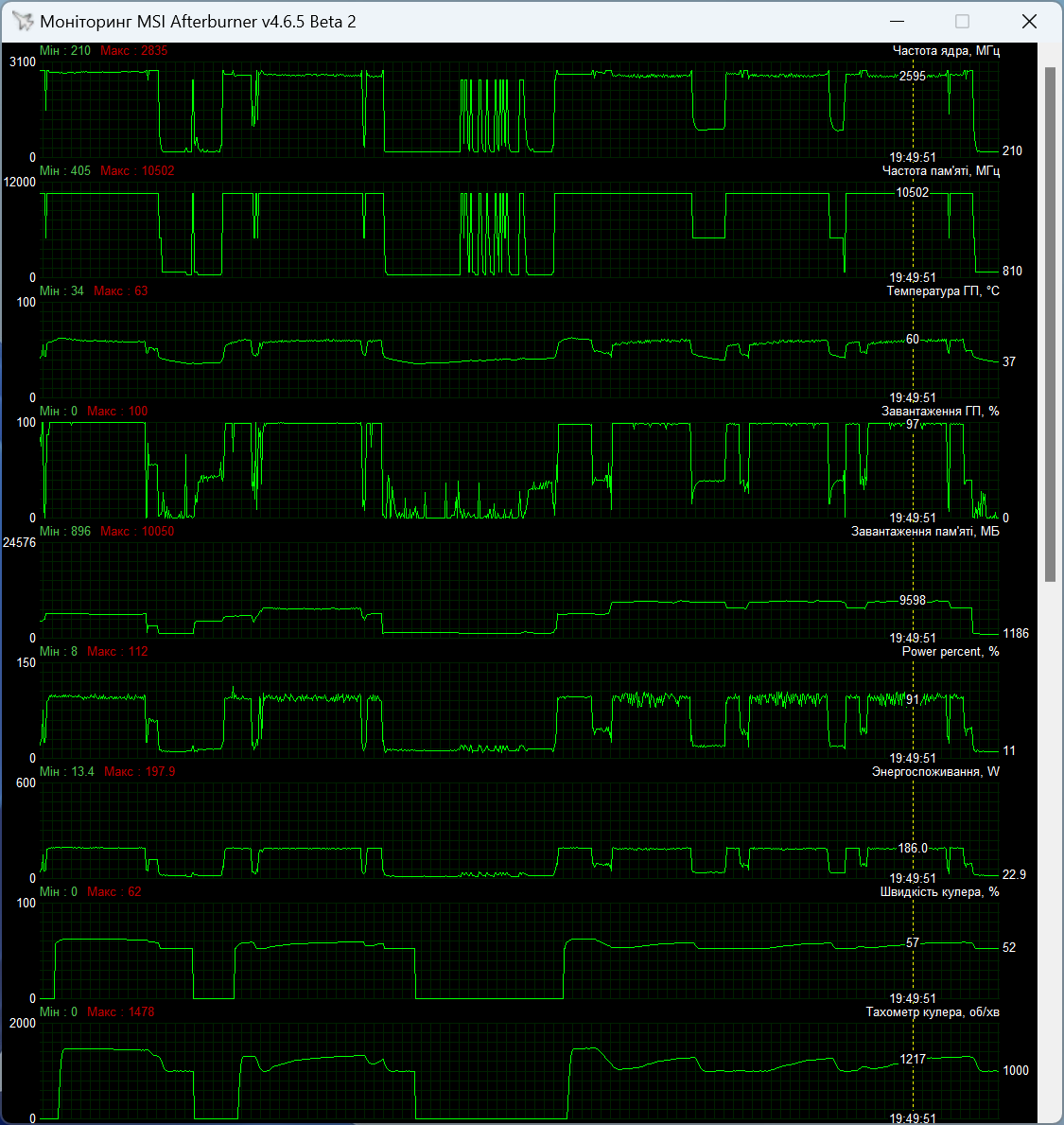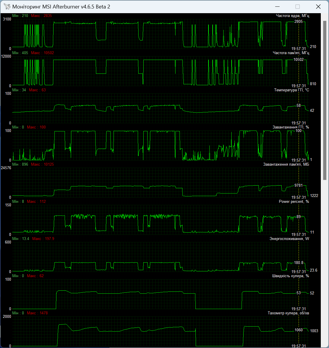 У реальних іграх частота GPU може сягати 2595–2700 МГц у проєктах зі складною графікою, 2700–2790 МГц або навіть 2805 МГц вже не в таких важких умовах. Температура чипа не перевищувала 58–60 градусів у відкритому корпусі з температурою 23 °C у приміщенні. Швидкість вентиляторів була на рівні 1060–1230 обертів на хвилину.