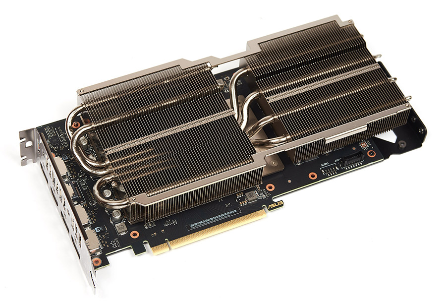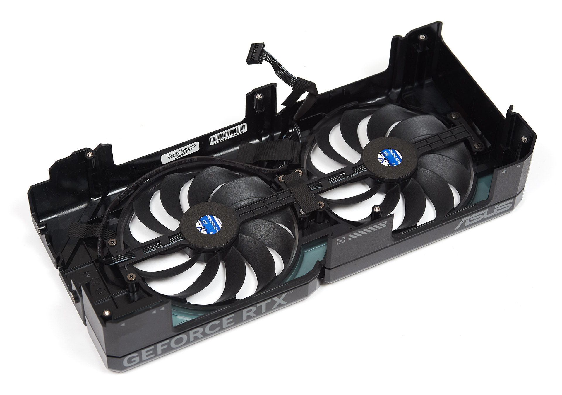 Для охолодження радіатора використовується два 95-мм вентилятори ASUS Axial-tech товщиною близько 10 мм та з 11 сильно загнутими лопатями, які об’єднані кільцем. В ньому використовуються дві кулькові вальниці що позитивно повинне вплинути на термін служби вентиляторів. Запускаються вони при нагріванні GPU до 55 градусів. На задній пластині є отвори, які дозволяють трохи поліпшити циркуляцію повітря всередині ПК.