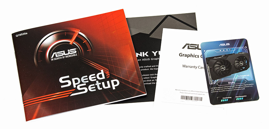 Відеокарта постачається в невеличкій довгастій коробці чорного кольору з фірмовим оформленням серії Dual. На її лицевій стороні зображено пристрій, а на зворотній — вказані головні особливості та характеристики продукту.
