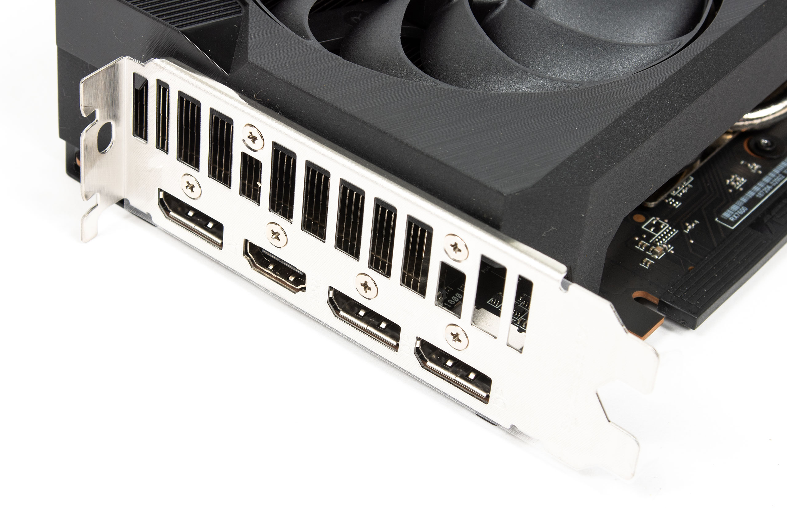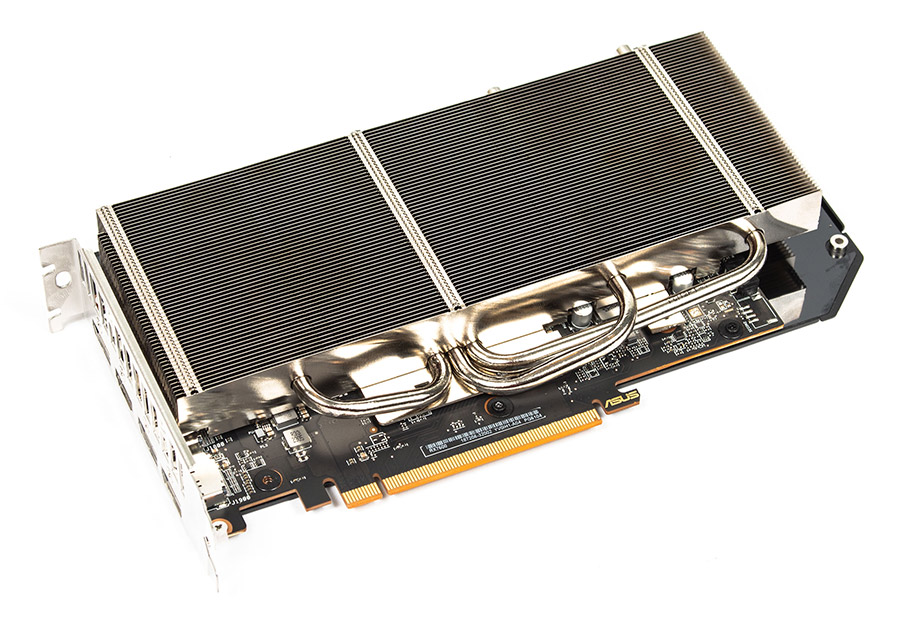 Задня планка виконана з нержавіючої сталі та має декілька великих отворів для кращої вентиляції. Там також встановлено три DisplayPort та один HDMI. Товщина карти складає 49 мм, тож вона займає 2,5 слоти.