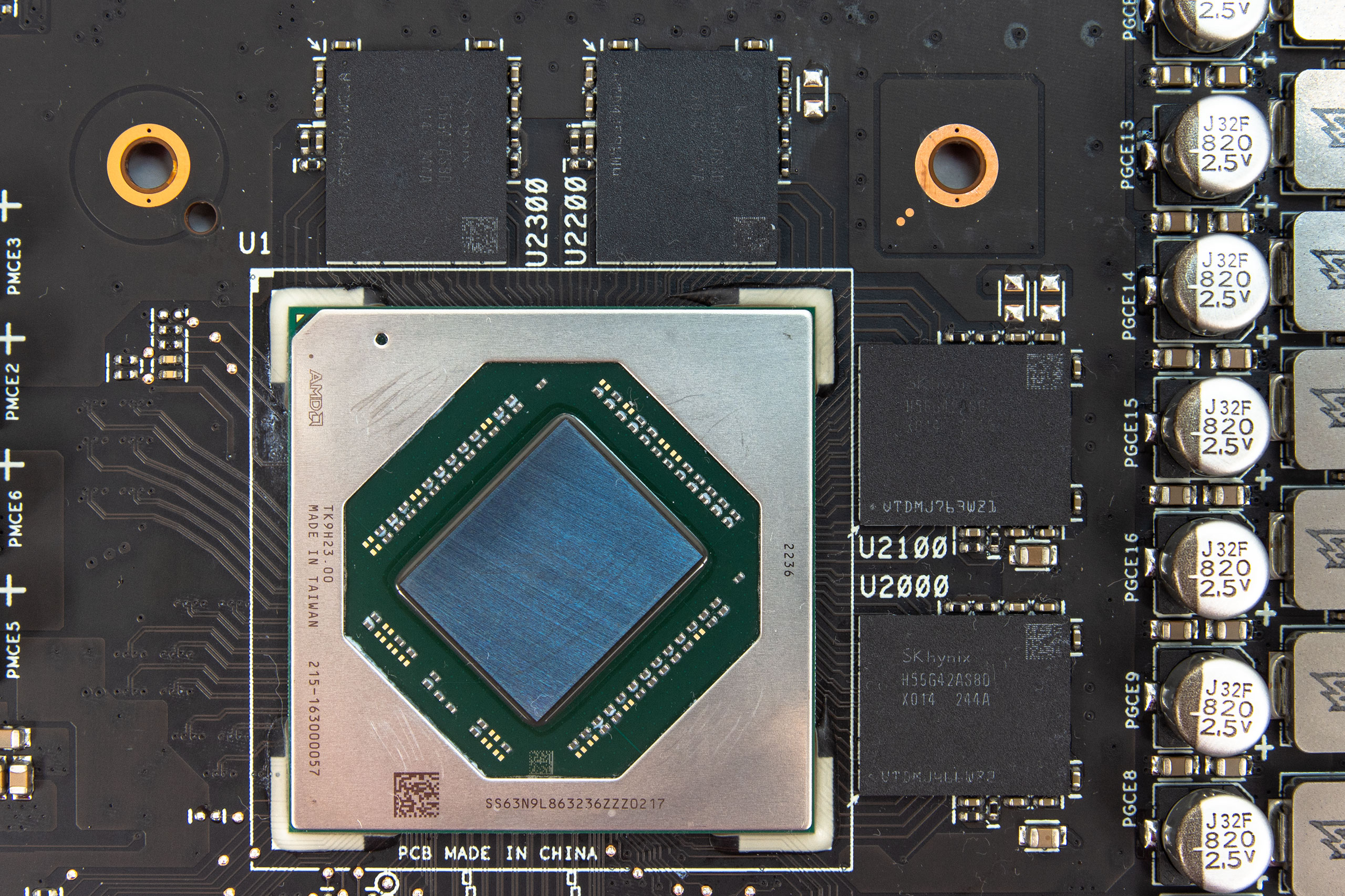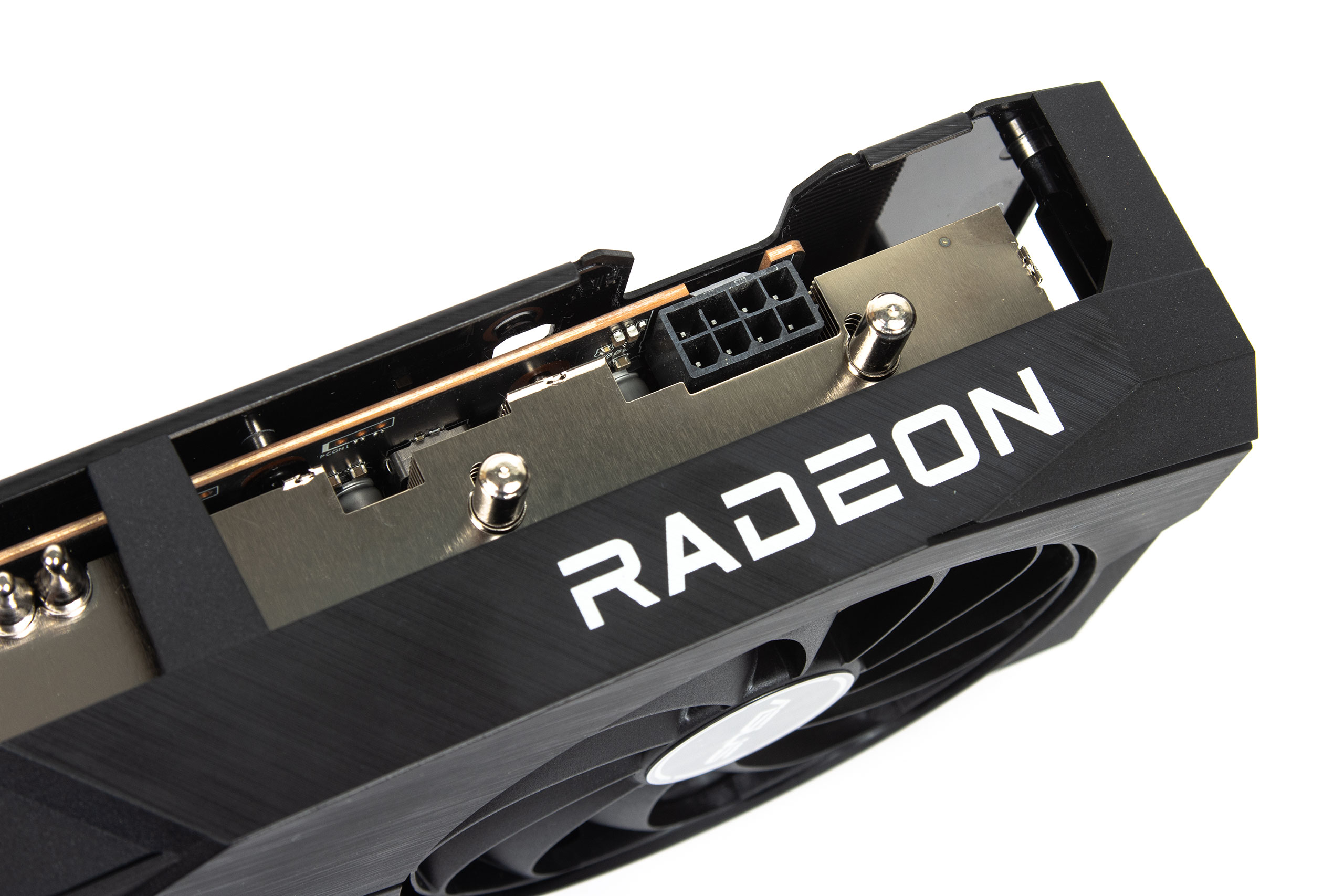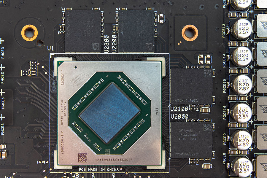 Чип Navi 33 зі встановленим під кутом кристалом має велику захисну рамку. З мікросхемами пам’яті SK Hynix H56G42AS8DX-014 він взаємодіє через 128-бітну шину. Загальний обсяг відеобуфера складає 8 ГБ.