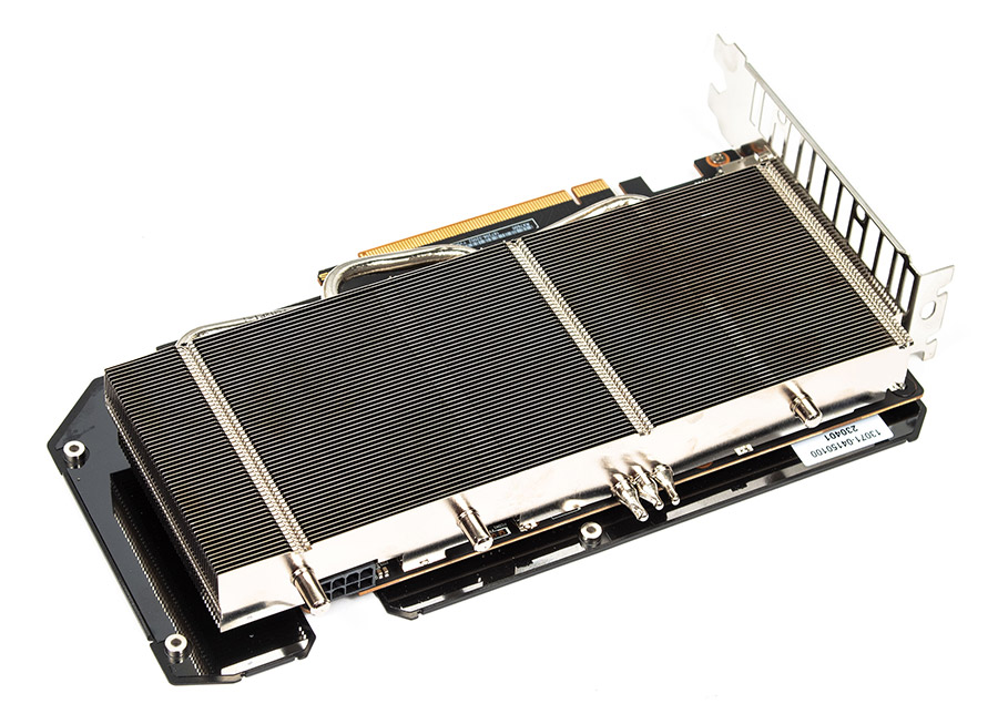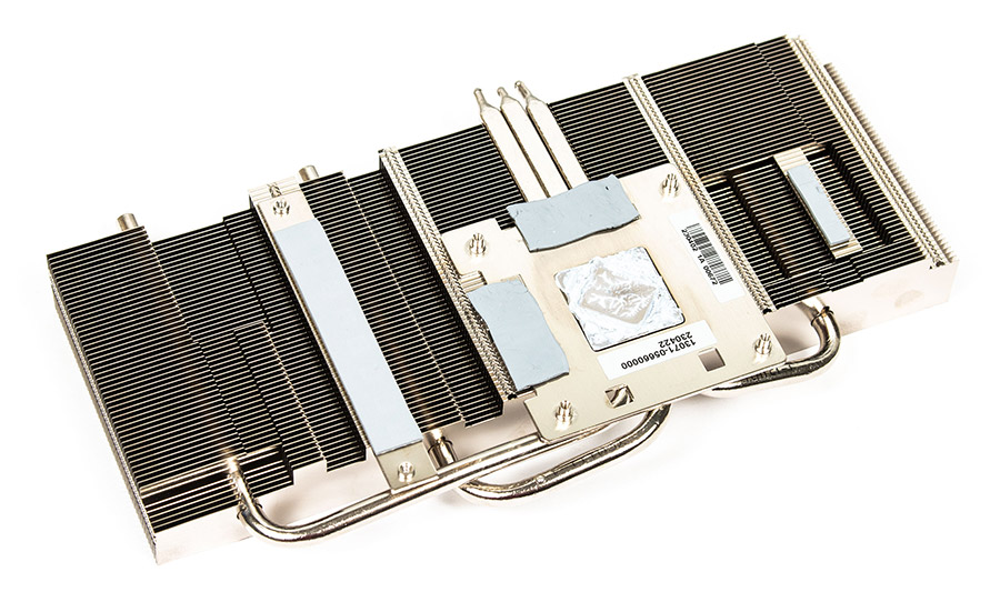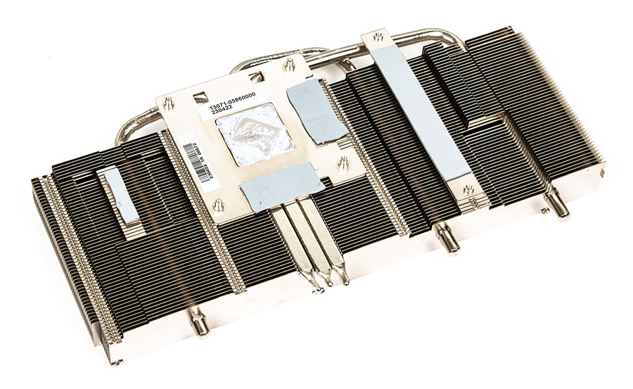 Складається він з одного масиву тонких нікельованих алюмінієвих ребер, які пронизують три теплових трубки. Тепло від кристала до них передається через мідну пластину, яка також контактує через прокладки з пам’яттю. Є ще невеличка пластинка напроти головної групи силових елементів та зона контакту з ребрами напроти ще декількох DrMOS. Там також використовуються термопрокладки.