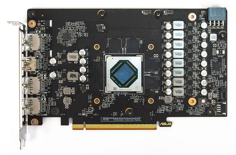 Друкована плата доволі велика, як для карти такого рівня, розпаяні фактично всі елементи. Цікаво, що така сама плата використовується для відеокарти серії Strix.