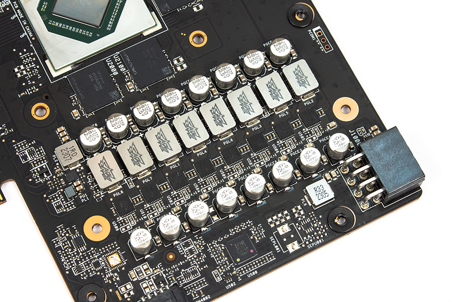 Для живлення GPU передбачено вісім фаз з DrMOS Vishay SiC654A, розрахованих на 50 А, тоді як для пам’яті — всього дві з тими ж самими елементами. Дроселі під навантаженням трохи пищать.