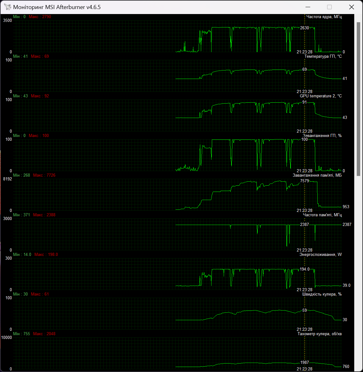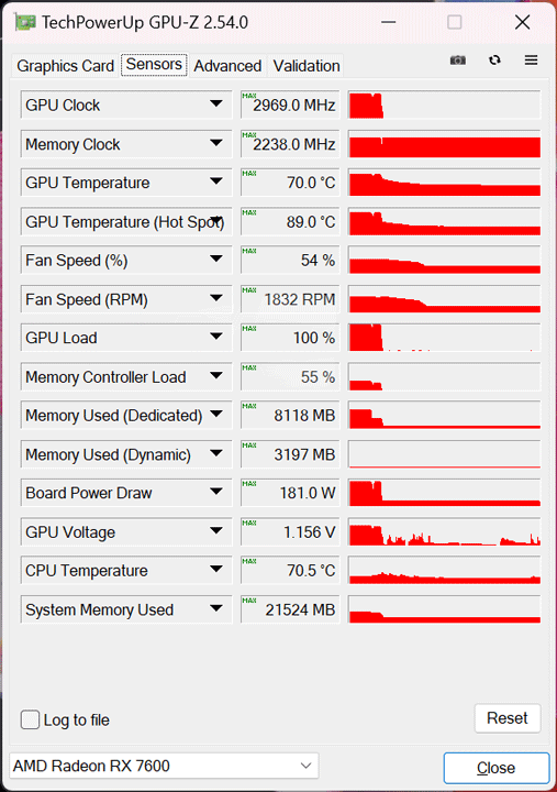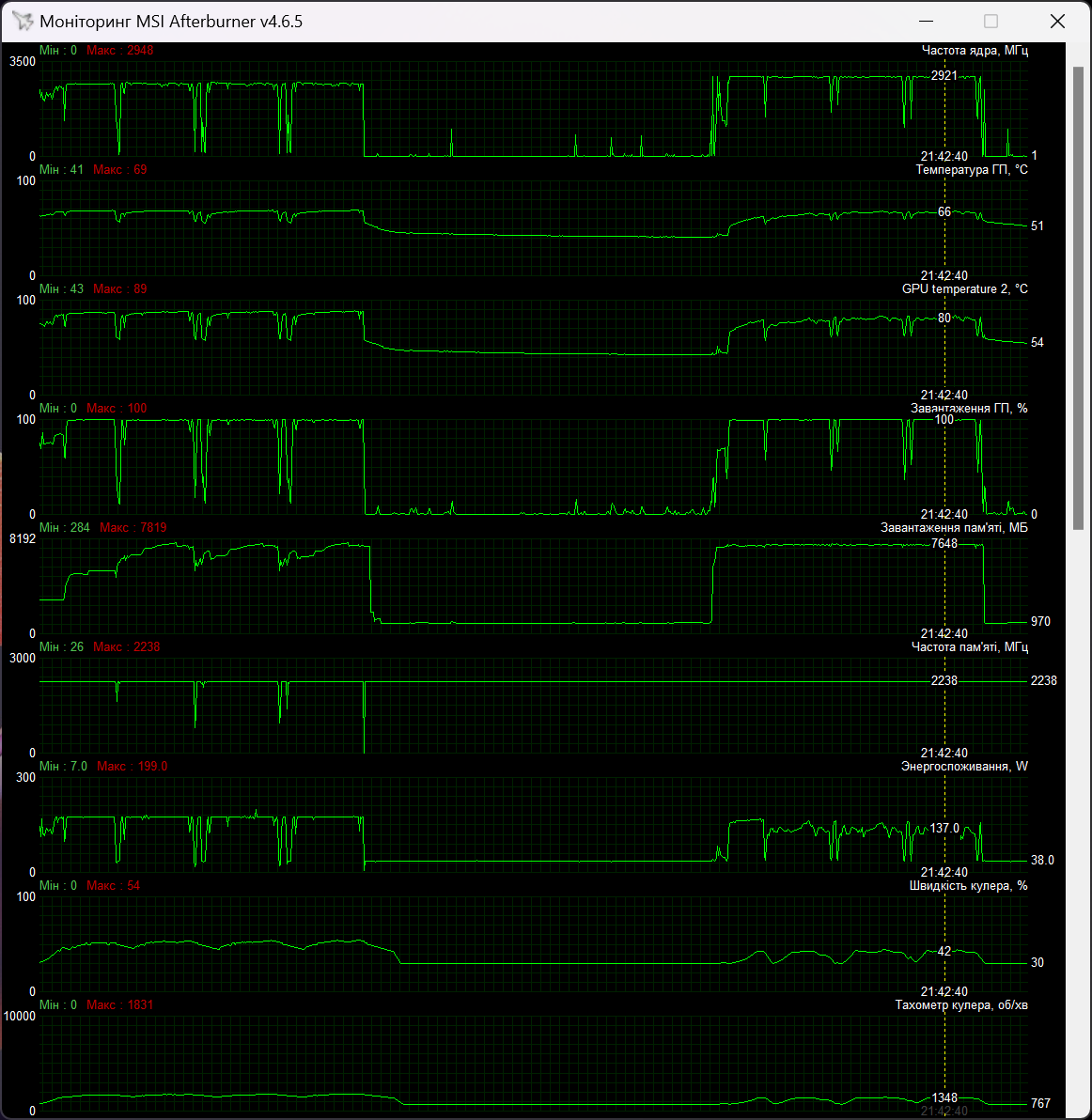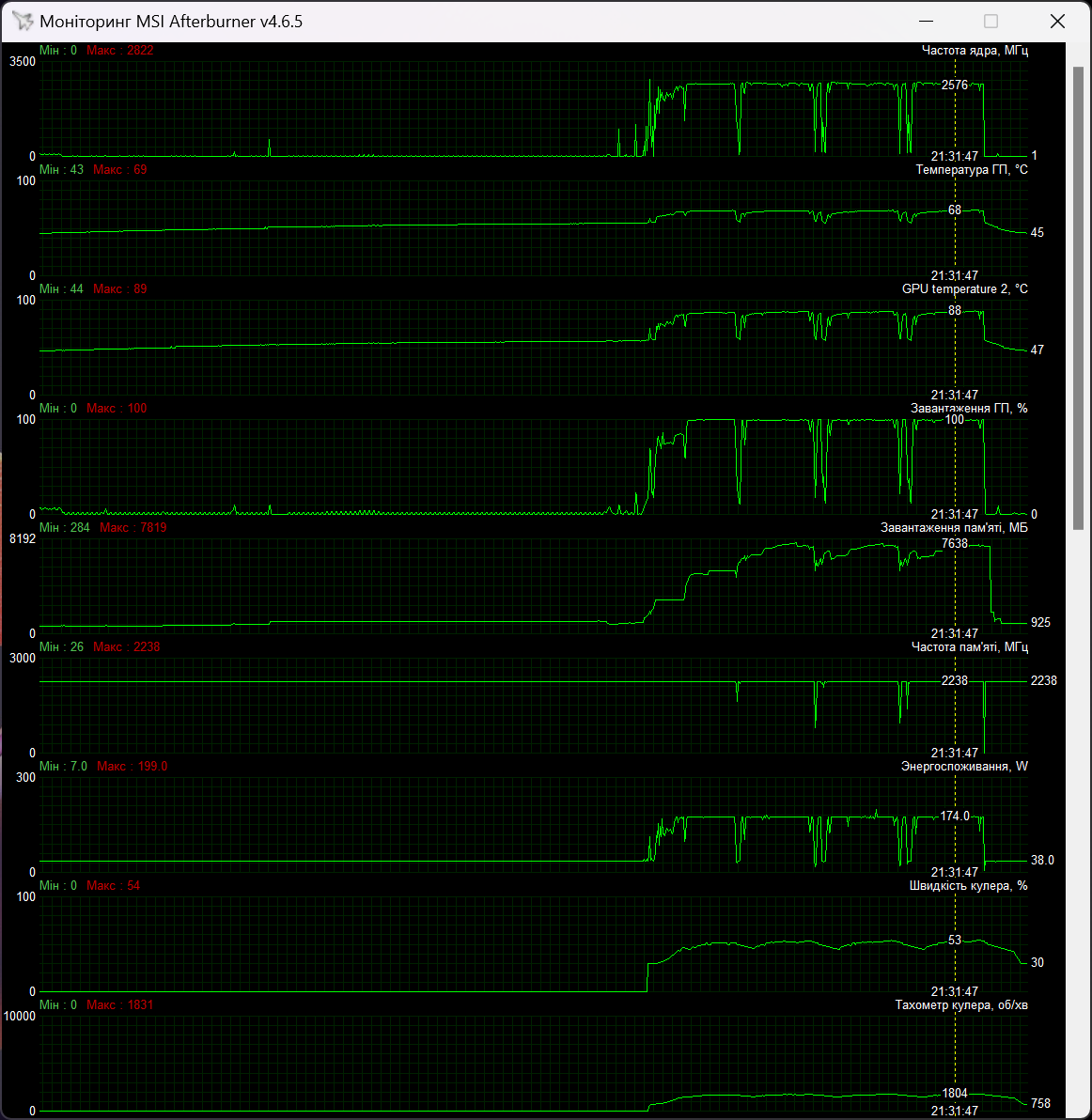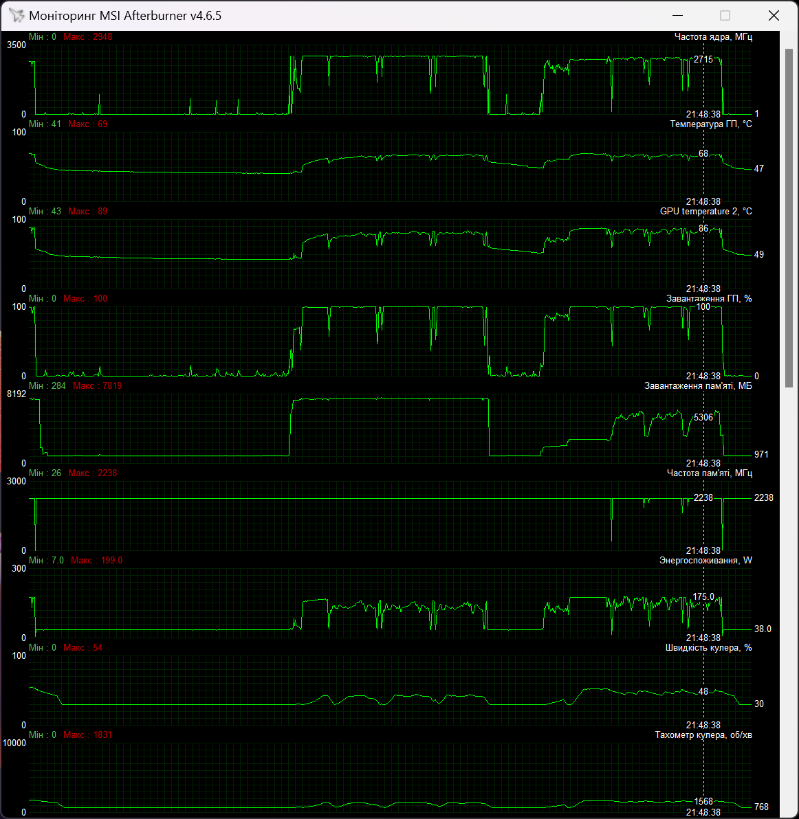 Чип при цьому нагрівався до 70 градусів, а Hot Spot був 89 °C. Швидкість вентиляторів максимально доходила до 1832 об/хв.