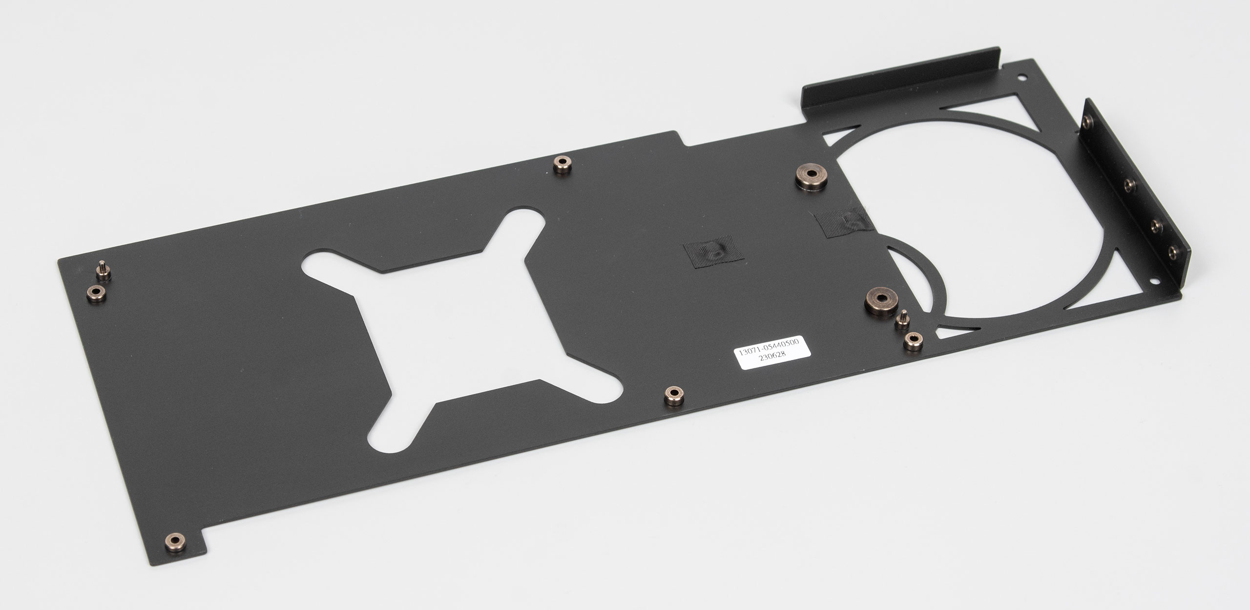 Пластина, яка контактує з чипом, скоріше за все, з алюмінієвого сплаву. Тепло до неї від GPU передається через сіру пасту, тоді як для пам’яті використовуються товсті термопрокладки. Також вони використовуються для силових елементів, напроти яких встановлені додаткові пластини.