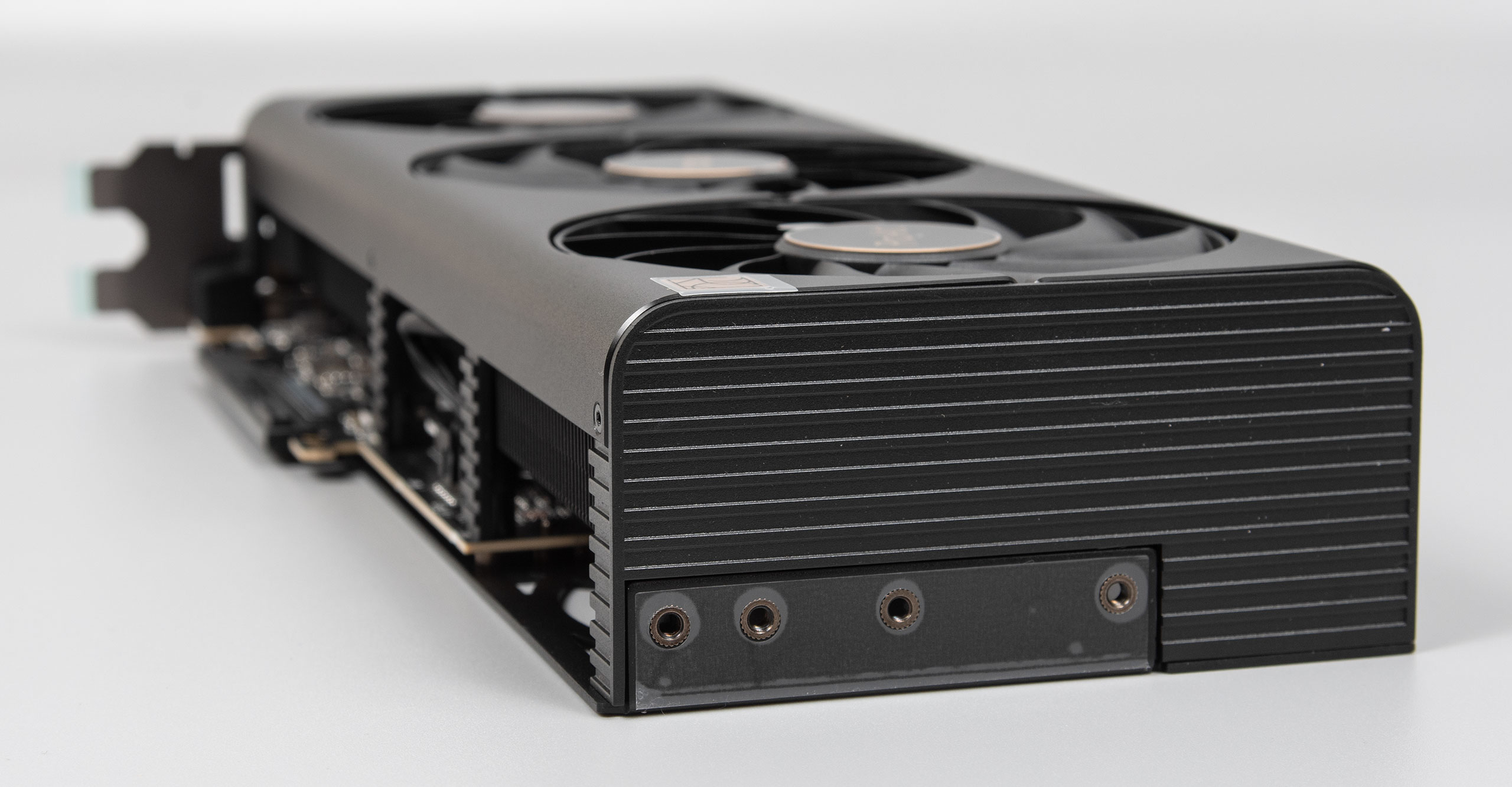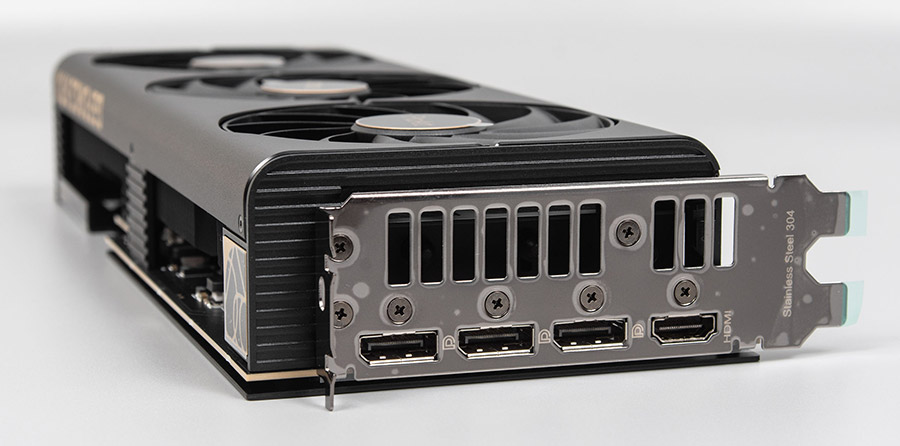 Інтерфейсні роз’єми мають стандартний набір з трьох DisplayPort 1.4a та одного HDMI 2.1a. На планці є великі отвори для виходу гарячого повітря.