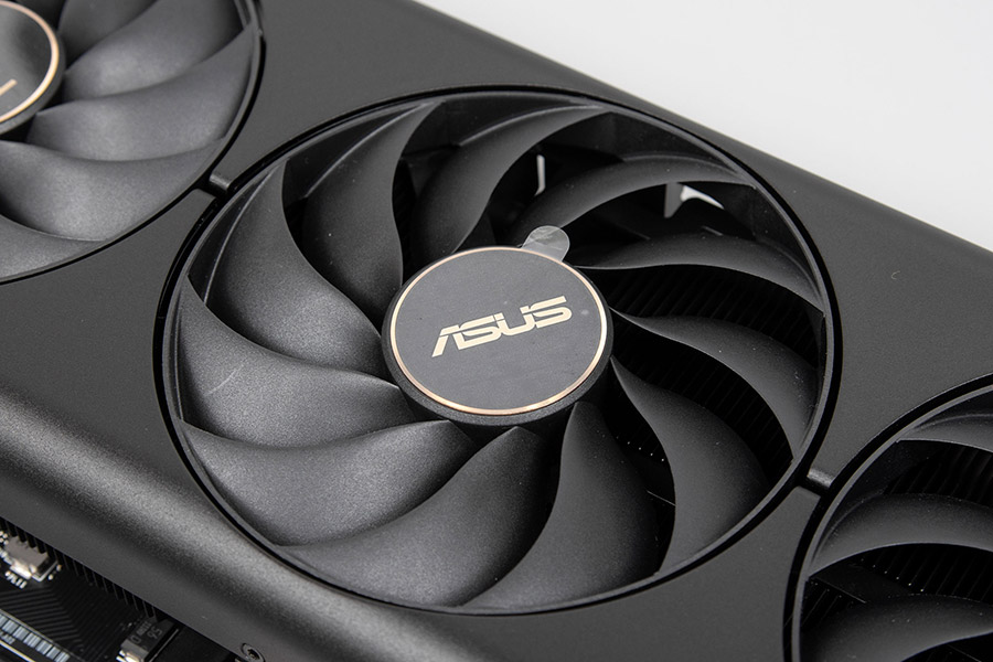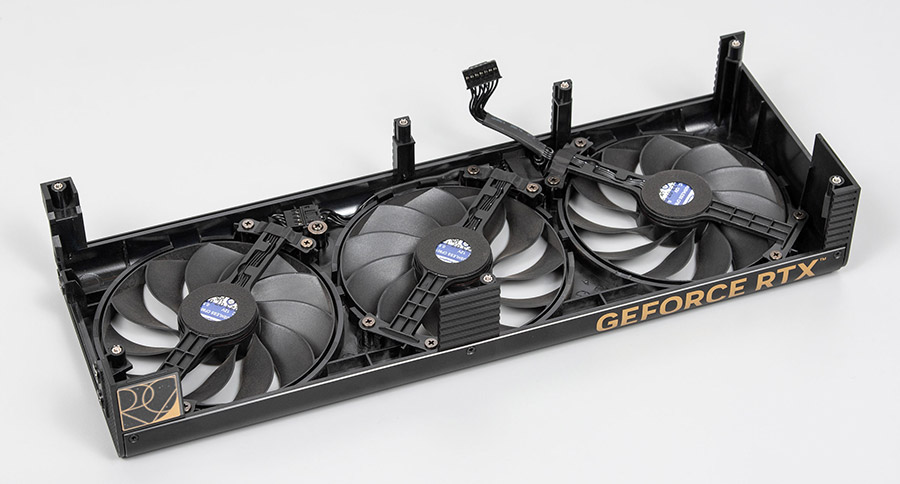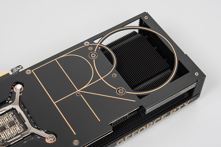 Внутрішній торець тут суцільний, тоді як на картах Strix він має решітку. Присутні отвори з різьбою для встановлення додаткового приладдя, як ручки чи кронштейни.