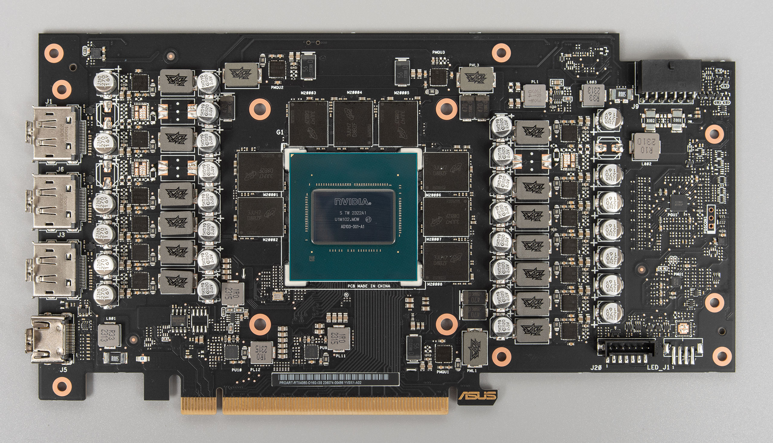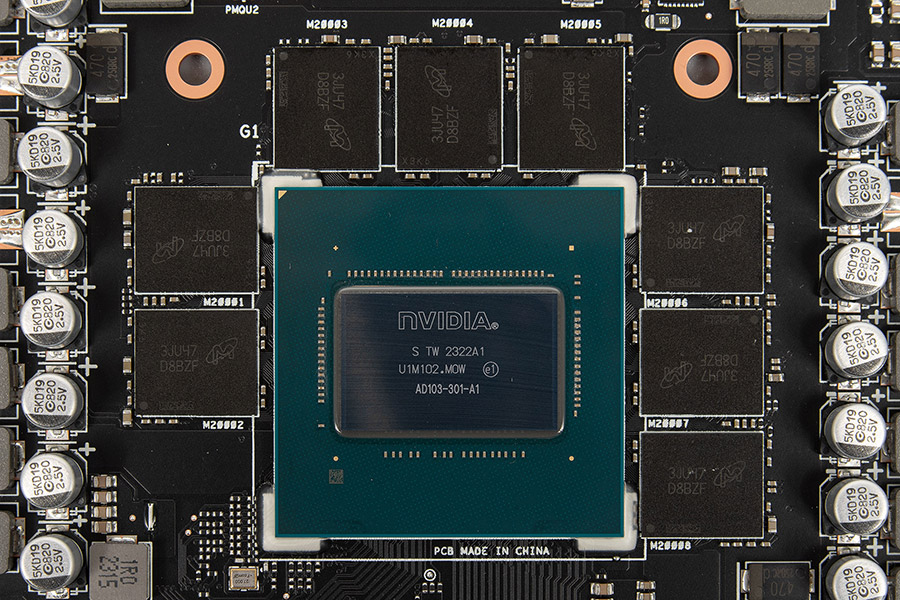 Графічний процесор AD103-301-A1 трохи довгастий та не має захисної рамки. З чипами пам’яті Micron 3JU47 D8BZF (MT61K512M32KPA-24:U) стандарту GDDR6X та загальним обсягом 16 ГБ він взаємодіє через 256-бітну шину.