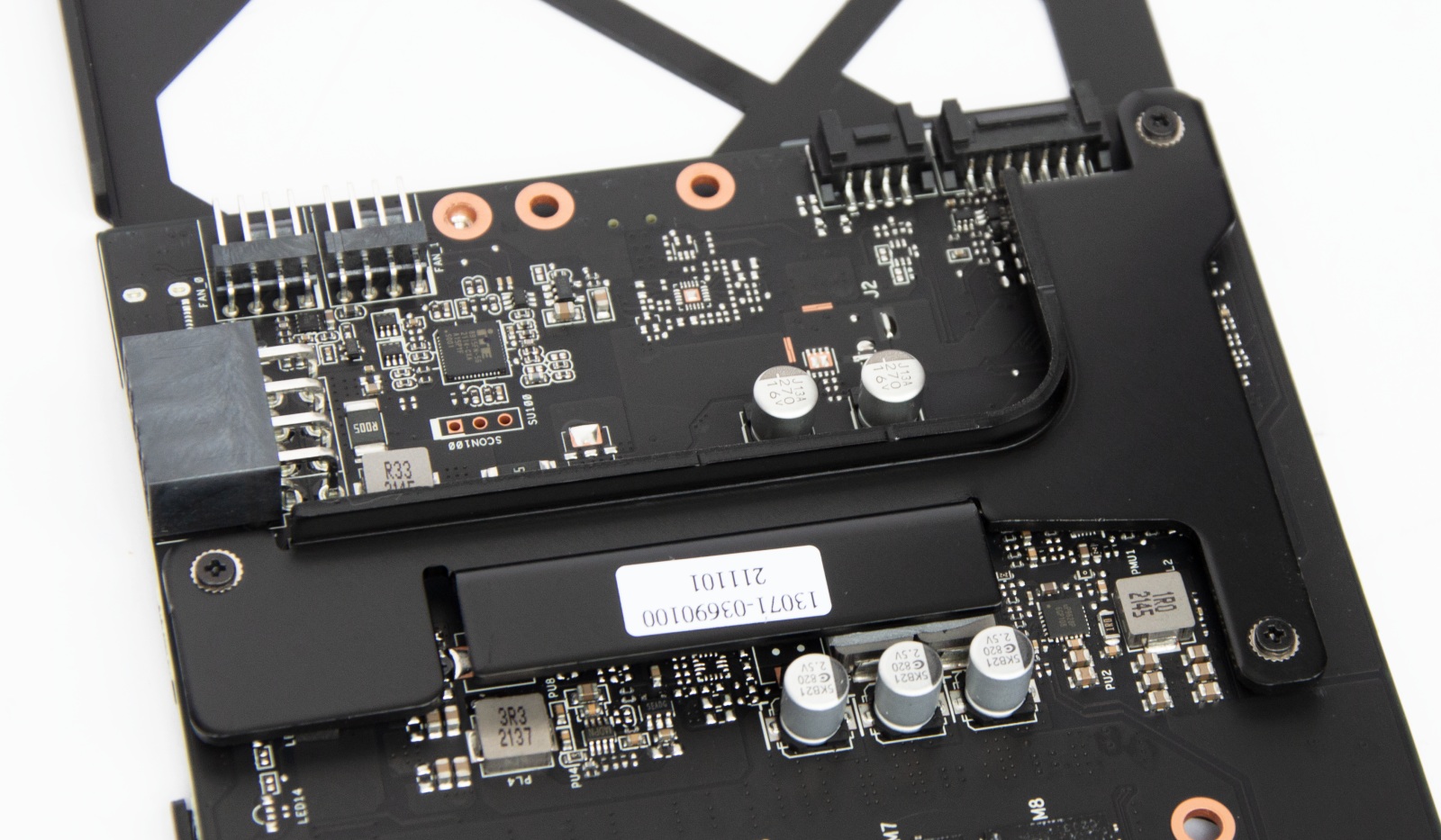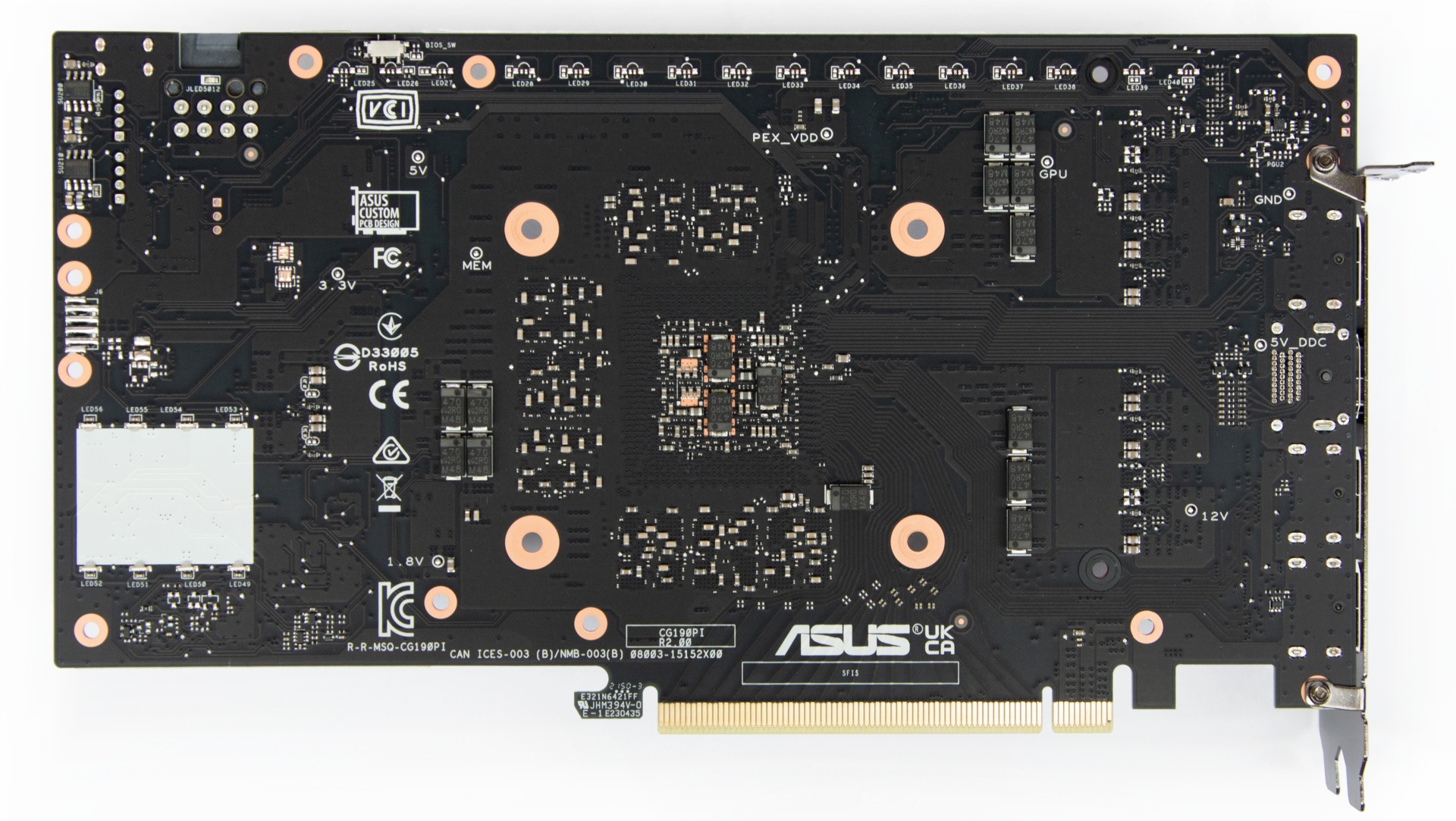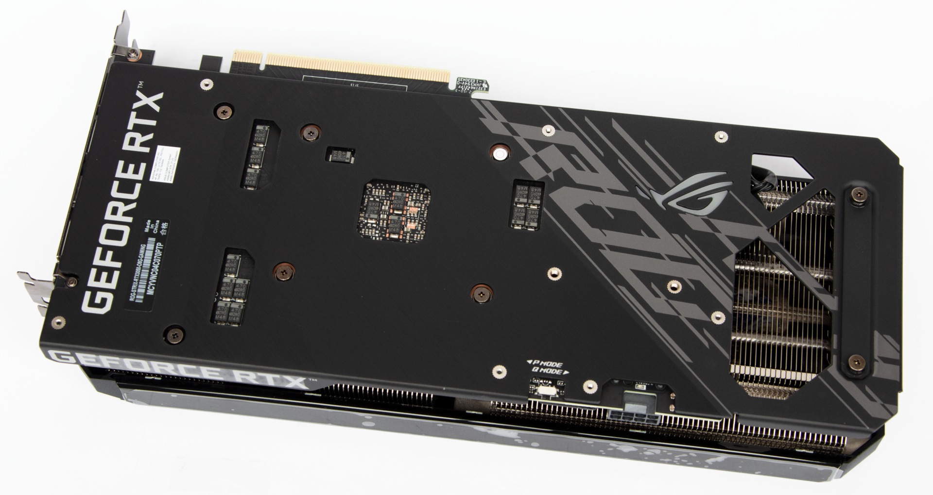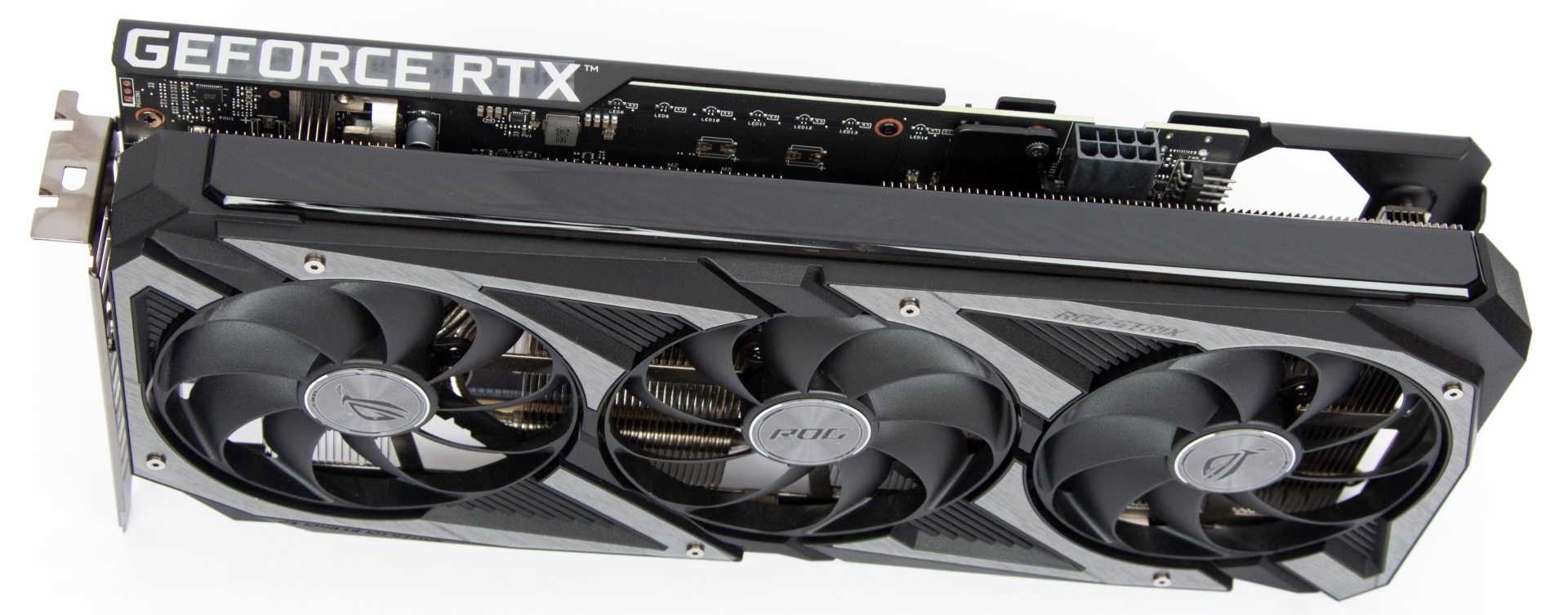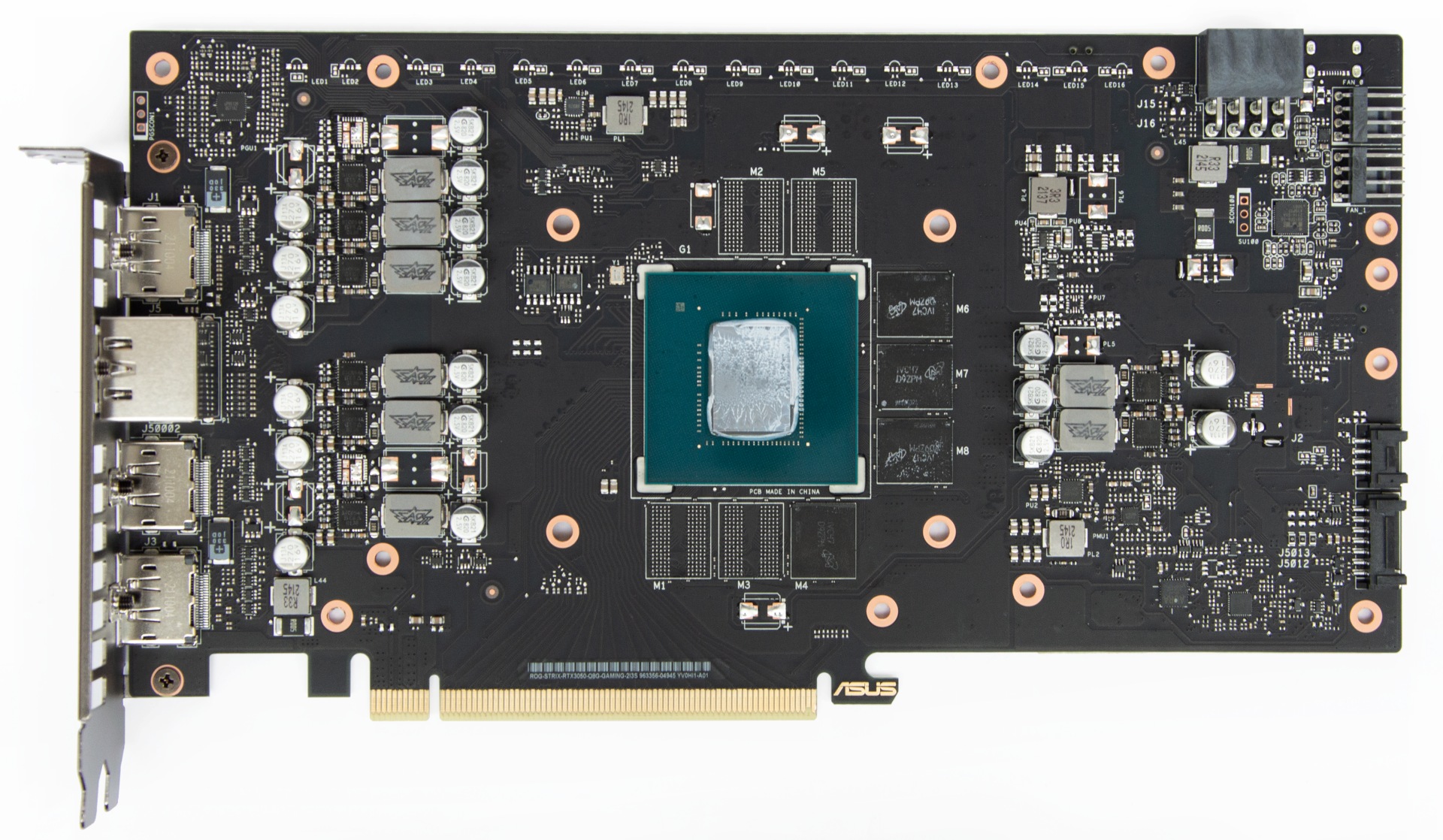 Дизайн плати повторює старші ROG-STRIX-RTX3060-O12G-GAMING та TUF-RTX3060TI-O8G-GAMING, але розпаяно менше фаз.
