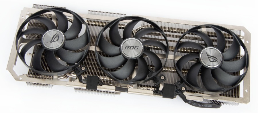 Зверху на радіатор встановлено три вентилятори діаметром 90 мм. Це особливі вентилятори ASUS Axial-tech із сильно вигнутими лопатями та зовнішнім кільцем. Такий дизайн дозволяє збільшити потужність повітряного потоку.