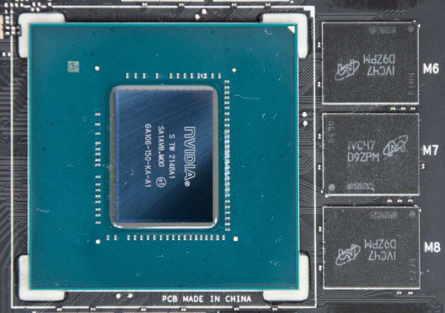 Повне маркування процесора GA106-150-KA-A1. Вісім гігабайтів пам'яті набрано чотирма мікросхемами Micron із маркуванням IVC47 D9ZPM.