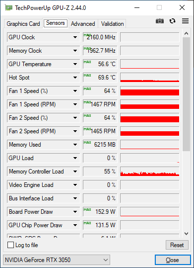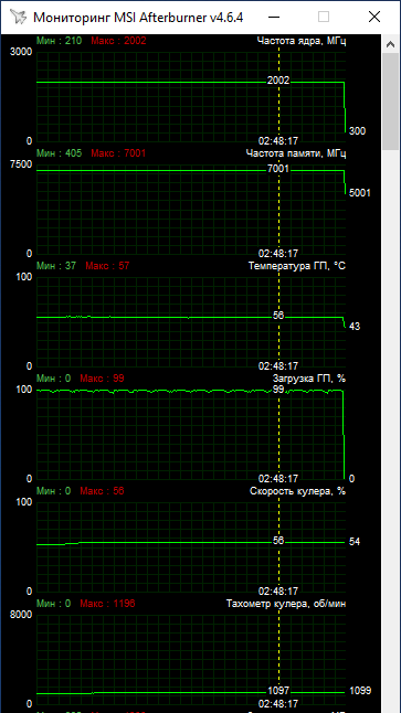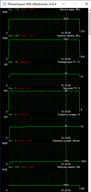 За замовчуванням увімкнено прошивку Performance, що забезпечує вищі оберти вентиляторів для знижених робочих температур. При цьому в умовах відкритого корпусу температура GPU не перевищувала 57 °C (в приміщенні 22 °C). Таке низьке нагрівання досягалося при швидкості вентиляторів 1100–1200 об/хв. Тобто відеокарта виявилася дуже холодною та тихою — ідеальне поєднання. Як приклад нижче скриншоти моніторингу під час тривалого навантаження стрес-тестом 3DMark Time Spy та Days Gone. Частота процесора трималася у межах 1987–2002 МГц й короткочасними піковими значеннями до 2010 МГц.
