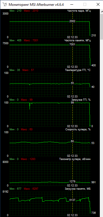 Стабільні 2 ГГц по ядру в номіналі вже відмінний результат. При додатковому розгоні на 140 МГц вдалося вийти на робочі частоти 2137–2145 МГц (до 2160 МГц у піку). Це чудові частотні показники для GPU GA106. Пам'ять прискорено до 15700 МГц.