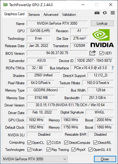В основі новинки графічний процесор Nvidia GA106, знайомий з GeForce RTX 3060. Але тепер він урізаний до 2560 потокових процесорів, 80 тензорних блоків, 20 блоків RT та 32 блоків растеризації. Шина пам'яті 128 біт та 8 ГБ пам'яті GDDR6. У минулому поколінні не було бюджетної відеокарти з трасуванням, нижню сходинку в ієрархії Nvidia займали GeForce GTX 1650 та GeForce GTX 1650 Super. І щодо них вийшов великий стрибок за кількістю обчислювальних блоків. Це настільки суттєвий прогрес, що GeForce RTX 3050 правильніше порівнювати з GeForce RTX 2060 та GeForce GTX 1660 Ti.