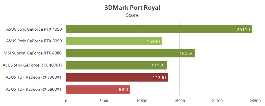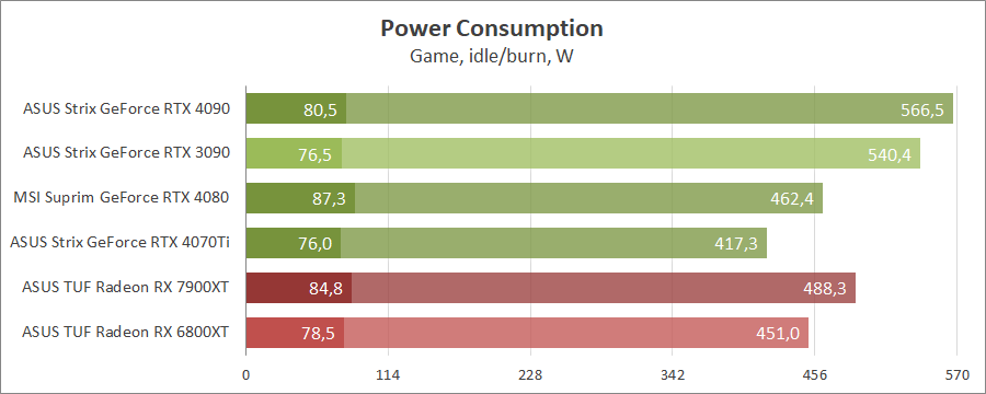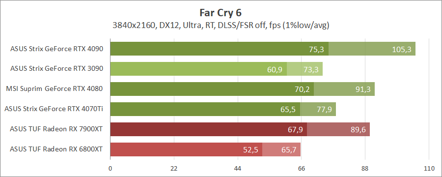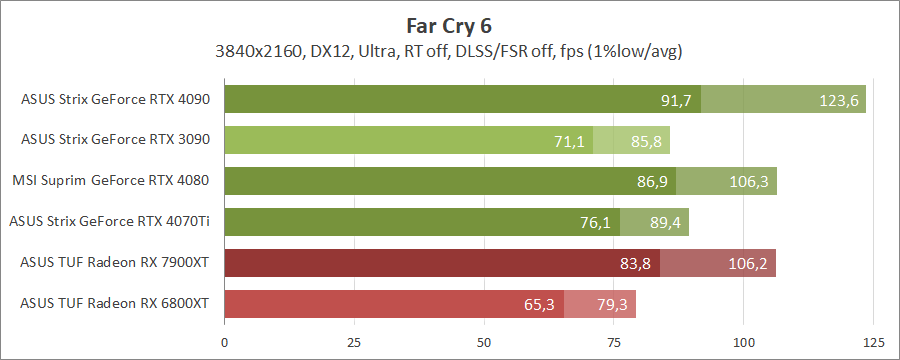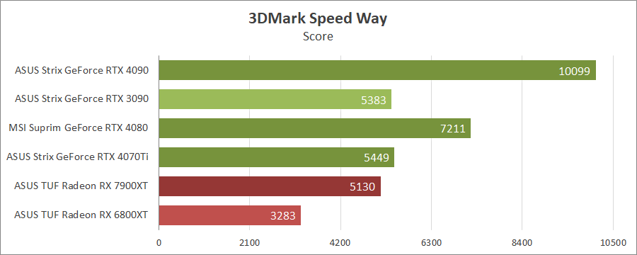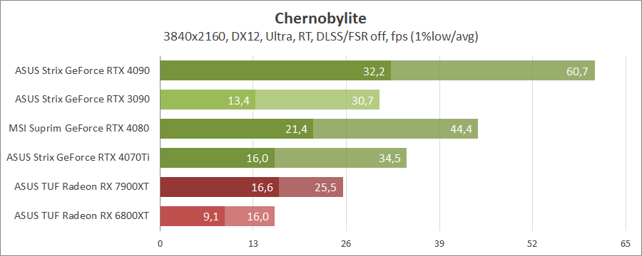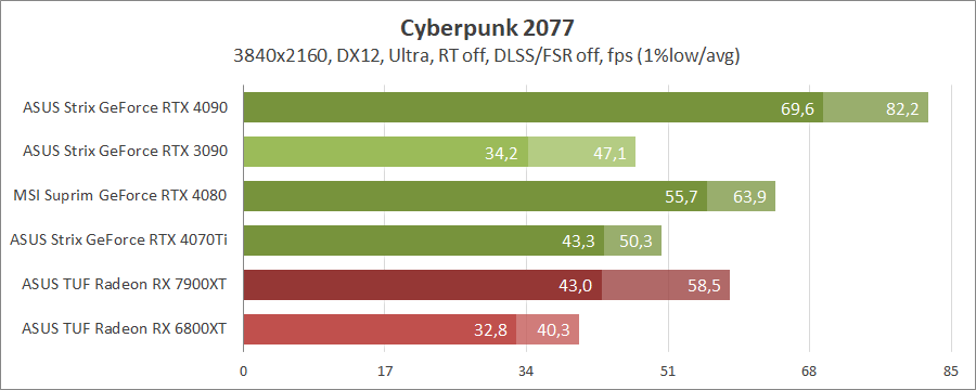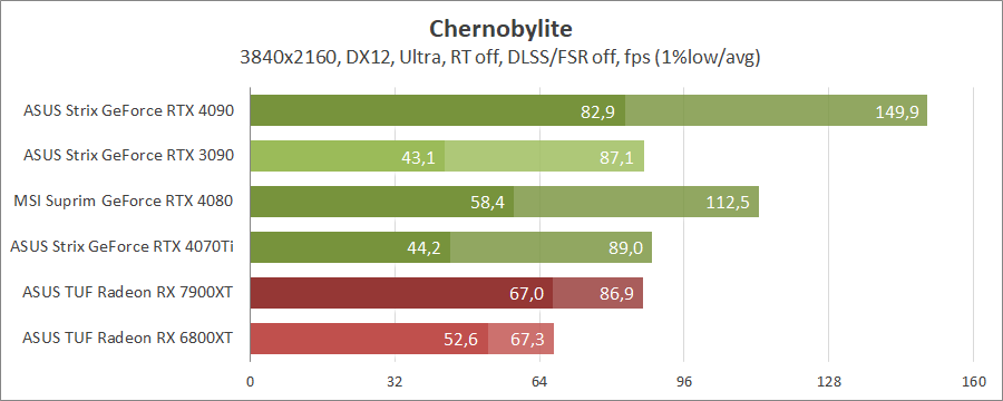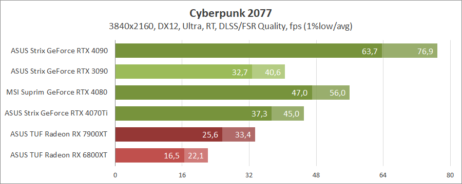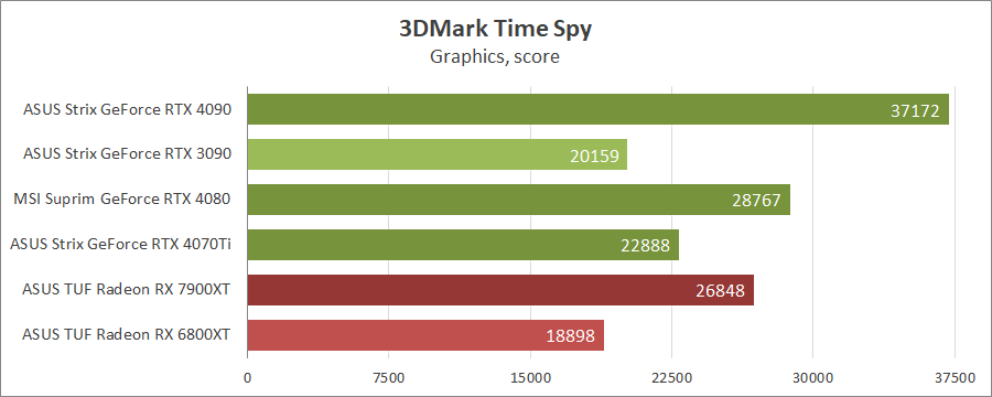 Для порівняння візьмемо карти MSI GeForce RTX 4080 16G Suprim X, ASUS ROG-STRIX-RTX4090-O24G-GAMING, ROG-STRIX-RTX3090-O24G-GAMING, TUF-RX7900-O20G-GAMING та референсну модель Radeon RX 6800 XT, які були в минулих тестуваннях.