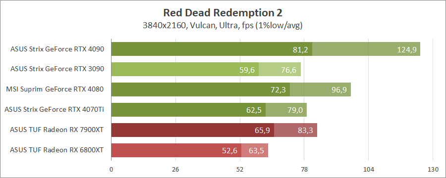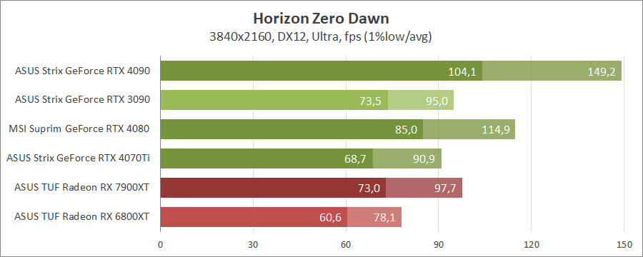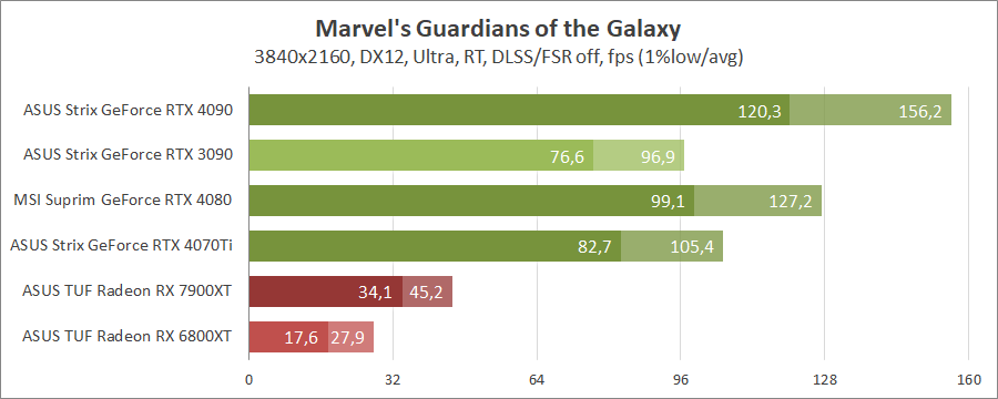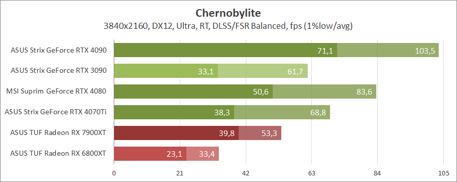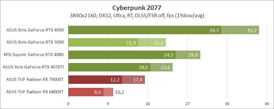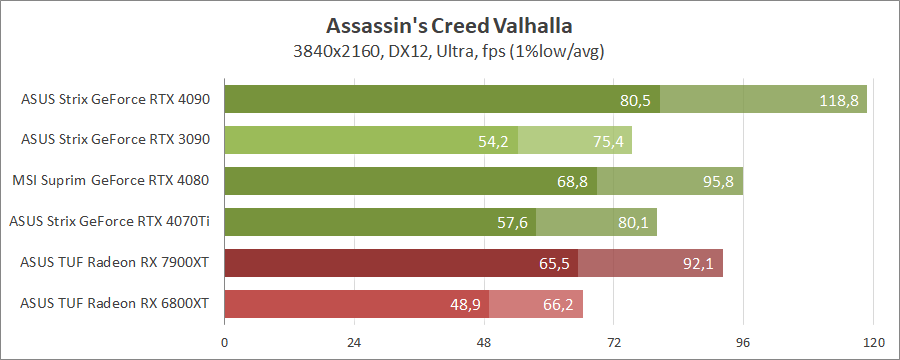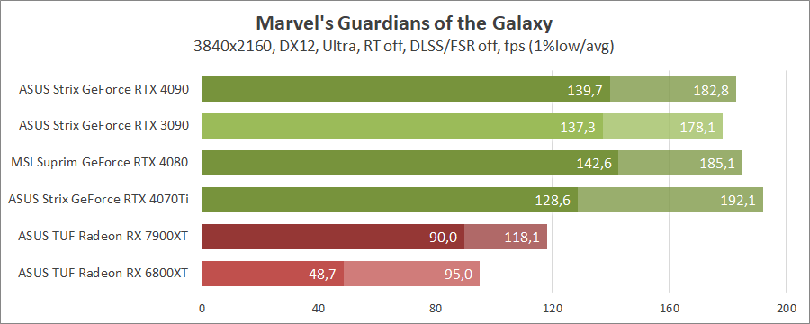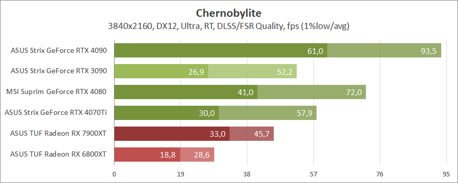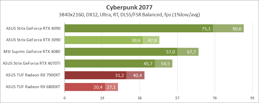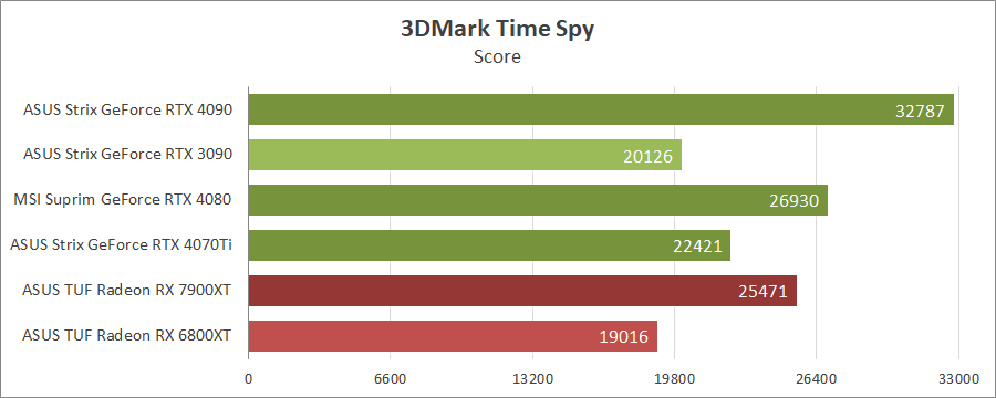 Для порівняння візьмемо карти MSI GeForce RTX 4080 16G Suprim X, ASUS ROG-STRIX-RTX4090-O24G-GAMING, ROG-STRIX-RTX3090-O24G-GAMING, TUF-RX7900-O20G-GAMING та референсну модель Radeon RX 6800 XT, які були в минулих тестуваннях.