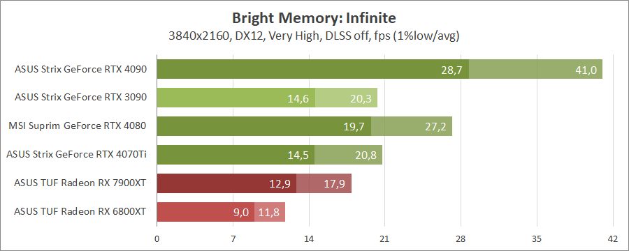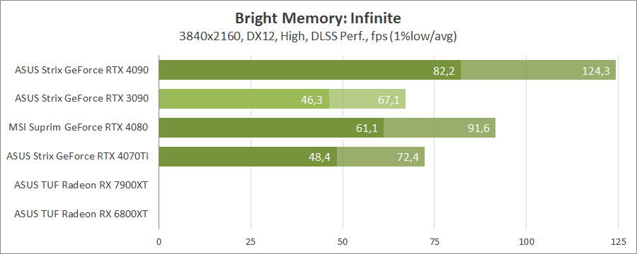 Тестування в іграх відбувалося при роздільній здатності 3840x2160 з пресетами якості графікі Ultra. Також були додані режими з активованими, де це можливо, параметрами трасування променів, але без DLSS. Режим DLSS додатково використовувався лише у двох іграх, а саме Cyberpunk 2077 та Chernobylite, як самих важких для відеокарт з RT. Бенчмарк Bright Memory: Infinite використовувався як з максимальною якістю без DLSS, так зі стандартними налаштуваннями. 3DMark також був зі стандартними налаштуваннями.