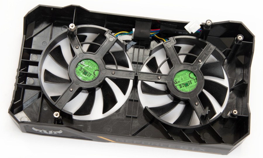 Зовнішній кожух з вентиляторами знімається без повного розбору відеокарти, що зручно, якщо вам потрібно провести очищення від пилу. Обдув здійснюється двома вентиляторами з крильчаткою діаметром 75 мм.