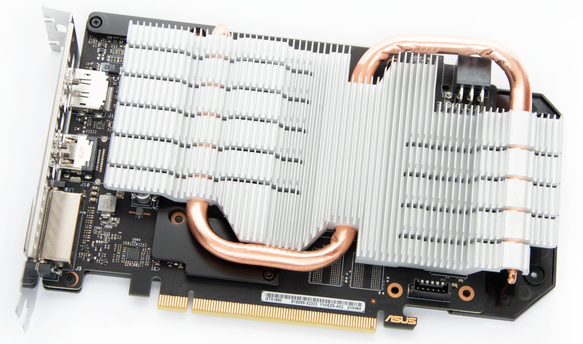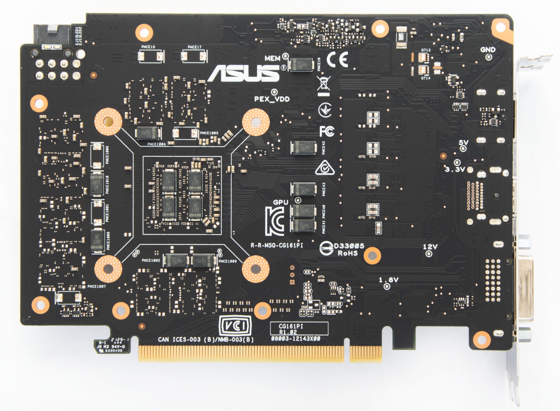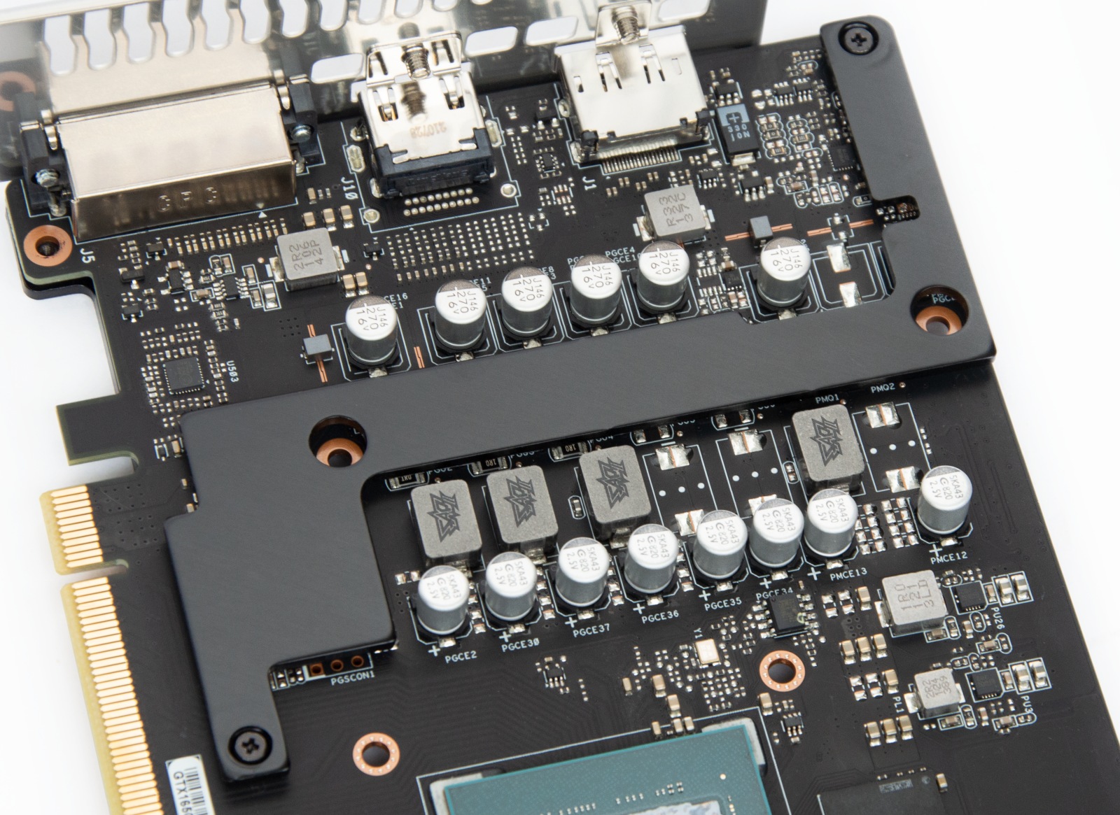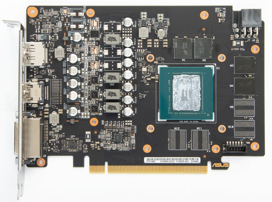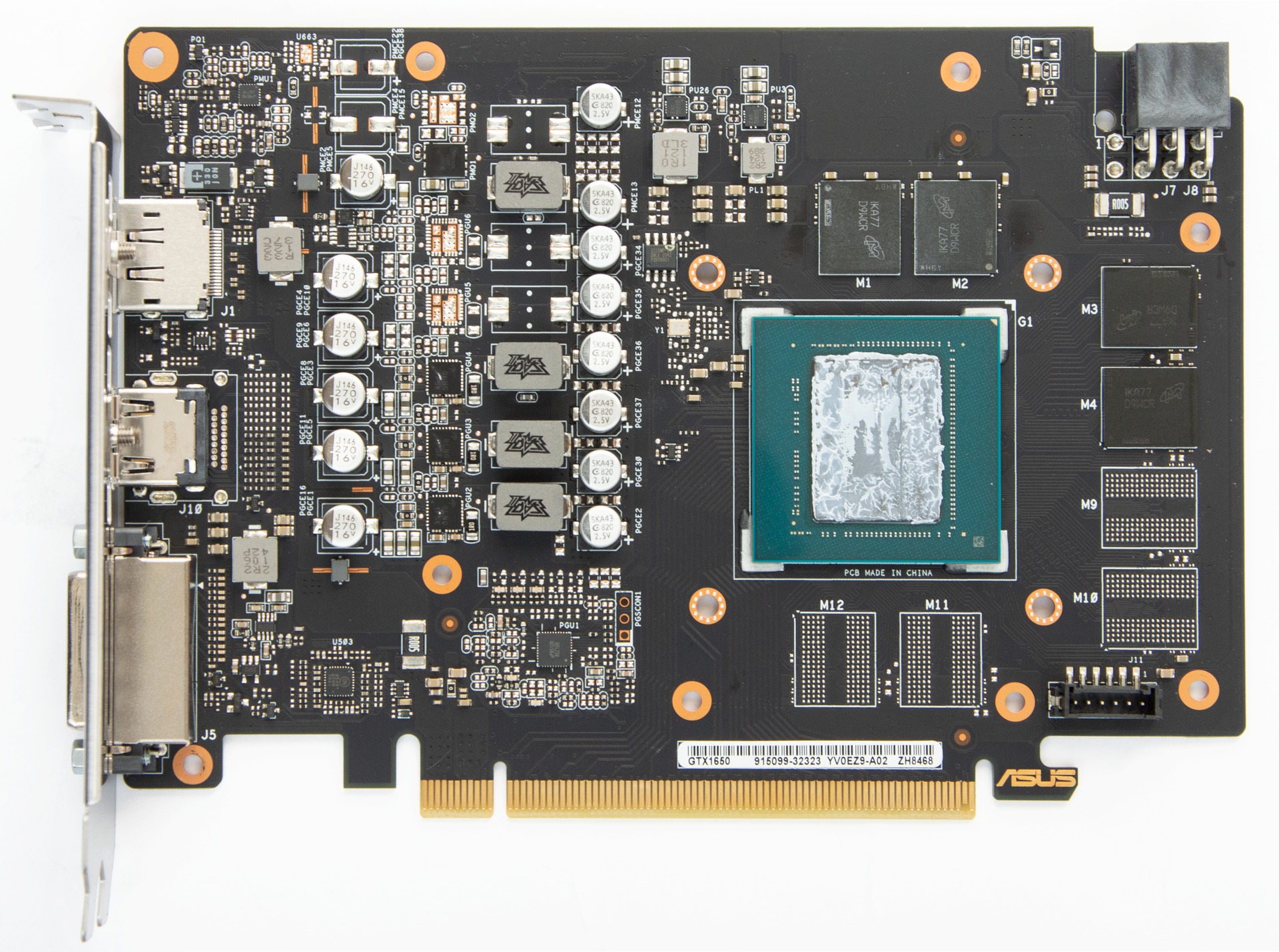 Друкована плата нагадує PCB старшої відеокарти ASUS TUF-GTX1650S-O4G-GAMING. Графічний процесор живиться від чотирьох фаз. Більше конденсаторів в обв'язці GPU, що пов'язано із застосуванням складнішого чипа.