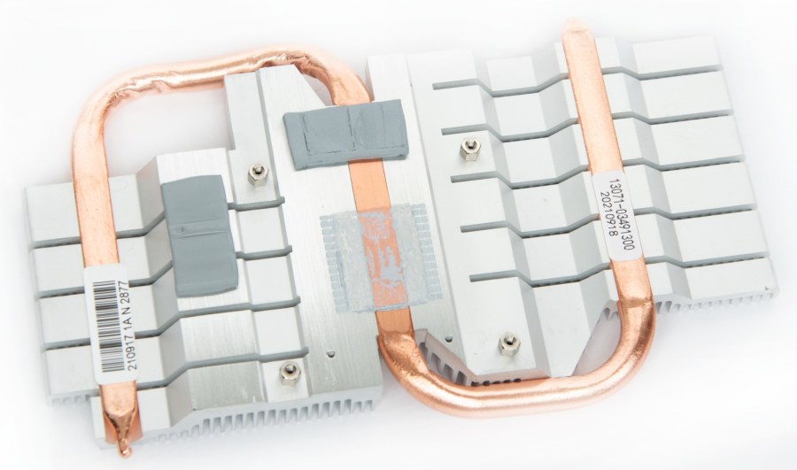 Вигнута теплова трубка проходить через центр радіатора та його бічні частини. Цей радіатор також охолоджує мікросхеми пам'яті через спеціальні пружні термопрокладки.