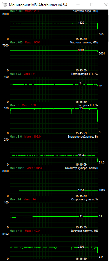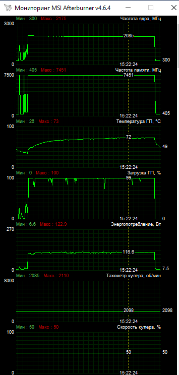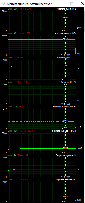 У стрес-тесті 3DMark Time Spy реальні частоти трималися в діапазоні 1950–1965 МГц. У Days Gone спостерігалися просідання до 1920 МГц. Короткочасні пікові значення до 2040 МГц. Температура GPU трималася в межах 70–72 °C при швидкості вентиляторів до 1850 об/хв (відкритий корпус).