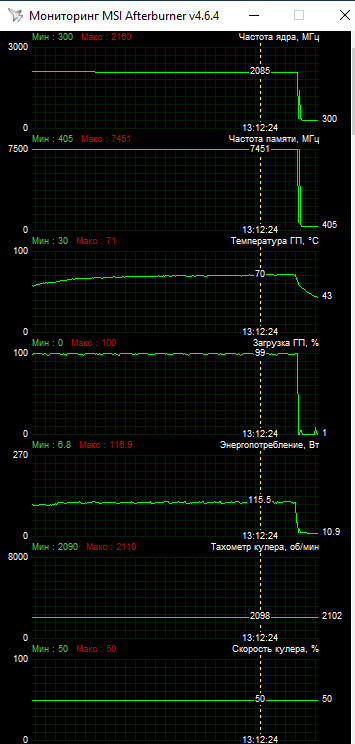 Швидкість вентиляторів зафіксована на рівні 2100 об/хв, що забезпечило температуру по основному датчику в межах 70–74 °C.