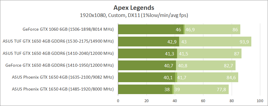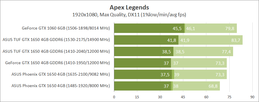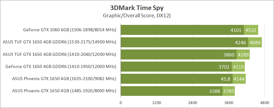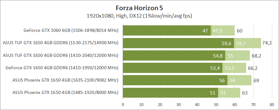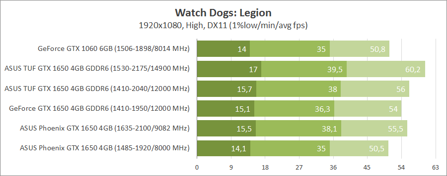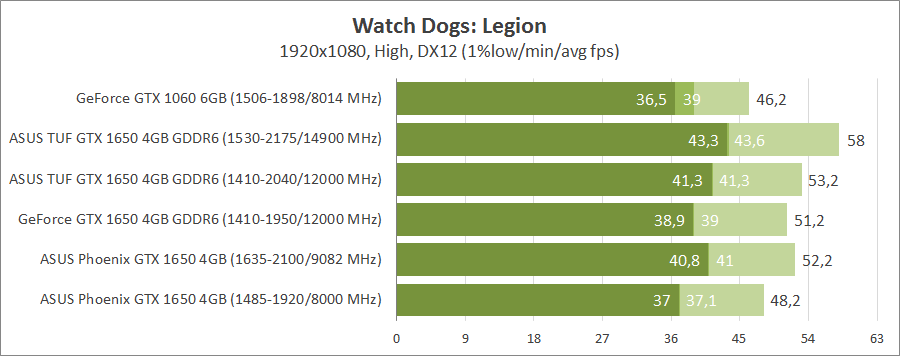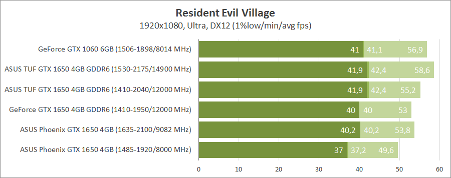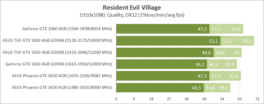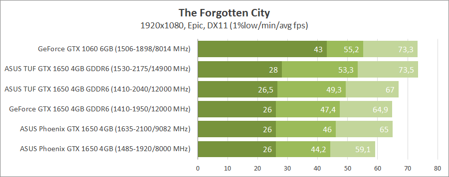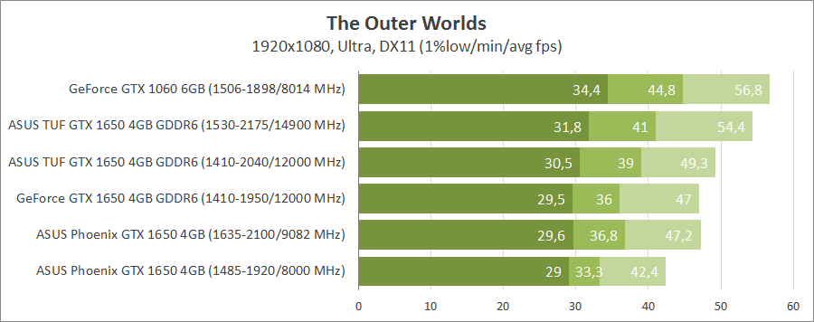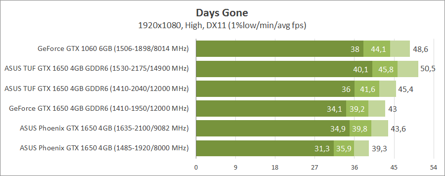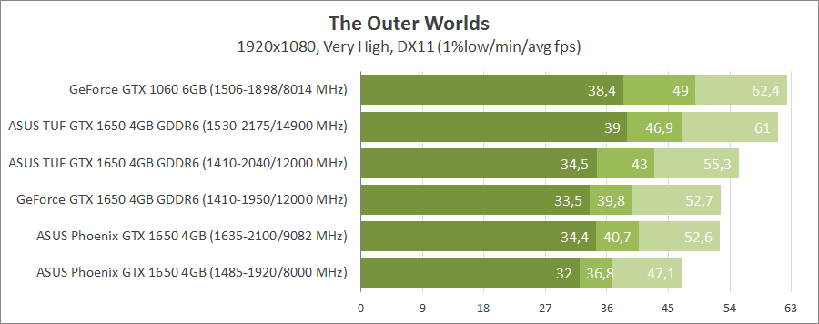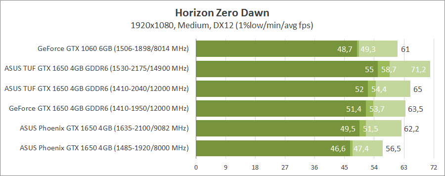 Для GeForce GTX 1650 перехід від пам'яті GDDR5 до GDDR6 забезпечує прискорення на 10%. Різниця між ASUS TUF та ASUS Phoenix при заводських частотах до 14%. Розгін прискорює ASUS TUF на 10%. Повністю компенсувати відставання від GeForce GTX 1060 не вдається.