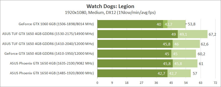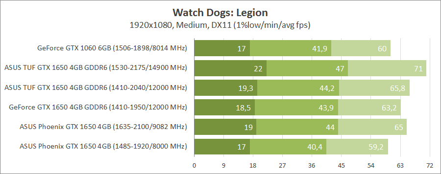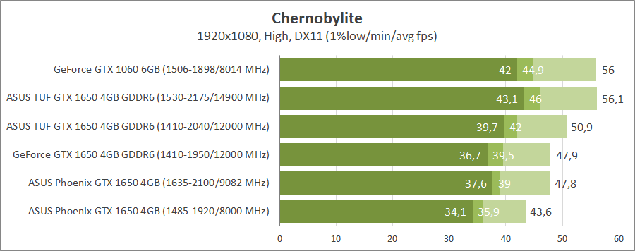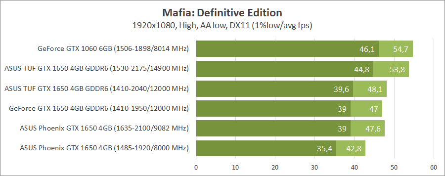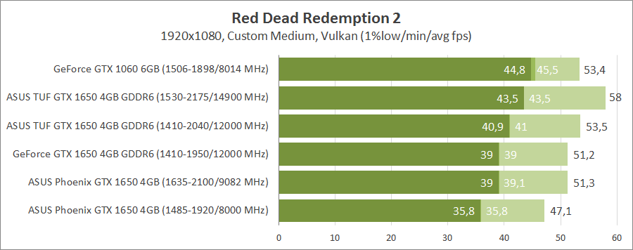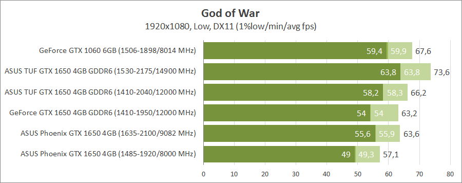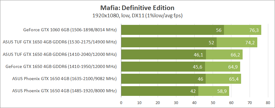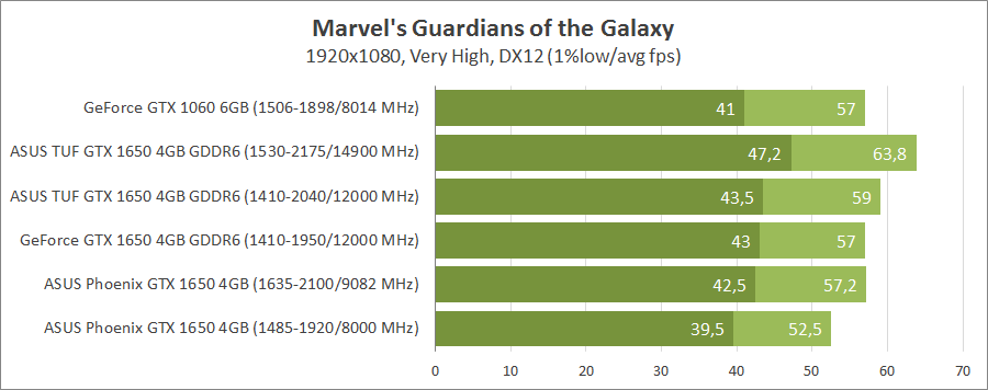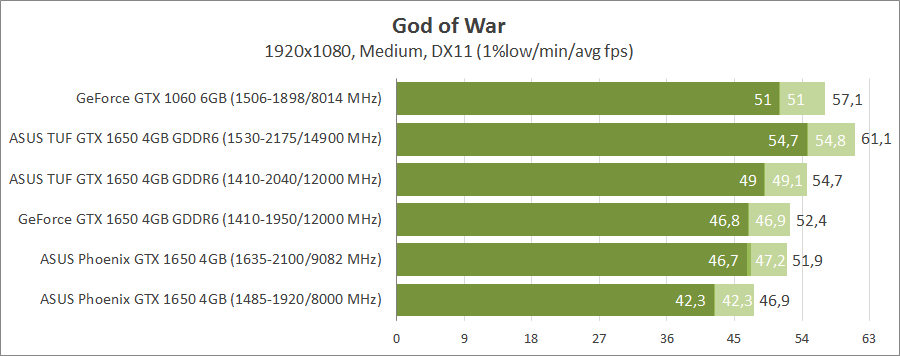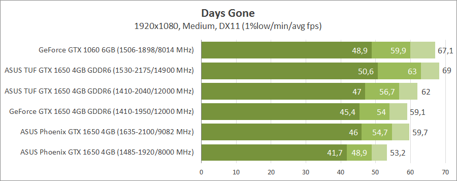 ASUS TUF Gaming GeForce GTX 1650 GDDR5 справляється із середньою якістю графіки, а молодша версія GeForce GTX 1650 тільки з низькими налаштуваннями. GeForce GTX 1060 трохи виграє в ASUS TUF із заводськими частотами, але поступається розігнаному варіанту. Якщо порівнювати GeForce GTX 1650 при подібних частотах GPU з різною пам'яттю, то різниця між ними 10–11%.