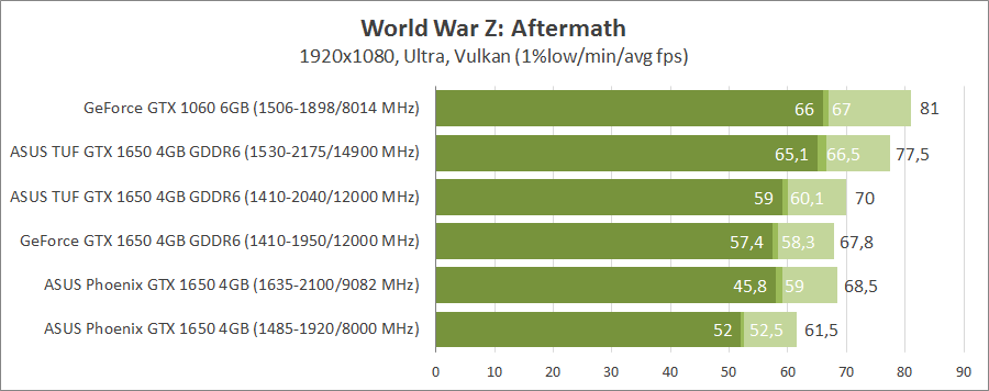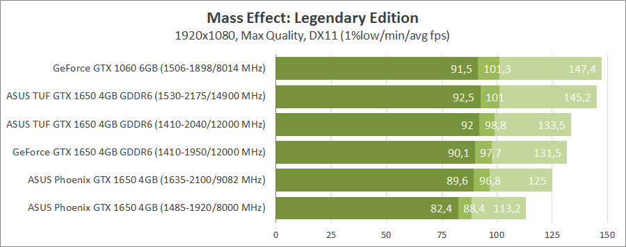 Непогані показники у грі навіть за Ultra-якості. Однак швидкодія при кожному новому прогоні сильно змінювалася, така нестабільність пов'язана з недостатнім обсягом відеопам'яті. Тому користувачам треба бути готовим до лагів або знижувати якість картинки. Молодша версія GeForce GTX 1650 при підвищених частотах можна порівняти з GeForce GTX 1650 GDDR6 і GeForce GTX 1060. ASUS TUF виграє ще пару відсотків завдяки заводському розгону GPU, а додатковий розгін прискорює ще на 8%.