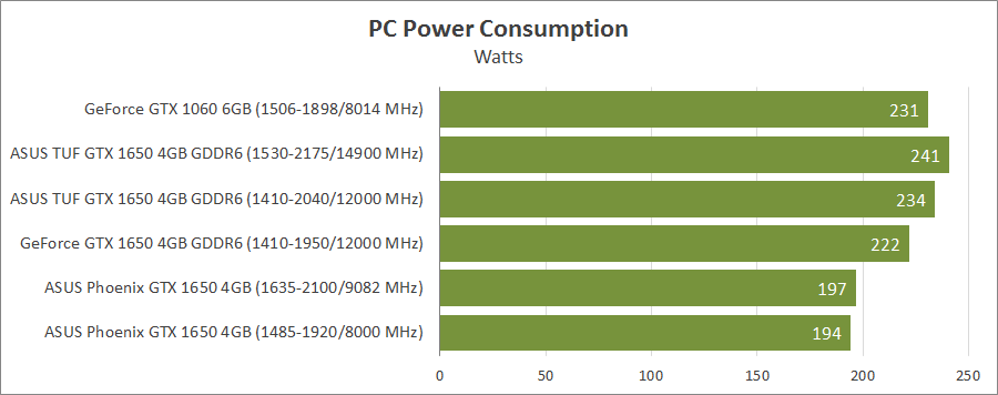 Найнижче споживання енергоспоживання у системи з ASUS Phoenix GeForce GTX 1650. Більш потужну версію ASUS TUF Gaming GeForce GTX 1650 GDDR6 можна порівняти з простою версією GeForce GTX 1060.