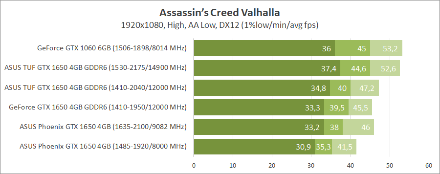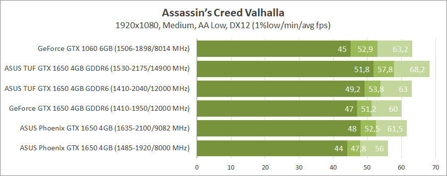 Для досягнення оптимальної продуктивності стандартні профілі Valhalla поєднувалися з низьким рівнем згладжування. У результаті при налаштуваннях High можна отримати близько 50 кадрів на старшій версії GeForce GTX 1650, яка в розгоні не поступається GeForce GTX 1060. Зі зниженням налаштувань навіть проста версія GeForce GTX 1650 з повільною пам'яттю здатна видавати прийнятний fps. Результати ASUS TUF GeForce GTX 1650 GDDR6 при заводських частотах кращі за показники звичайної версії GeForce GTX 1060 6GB.
