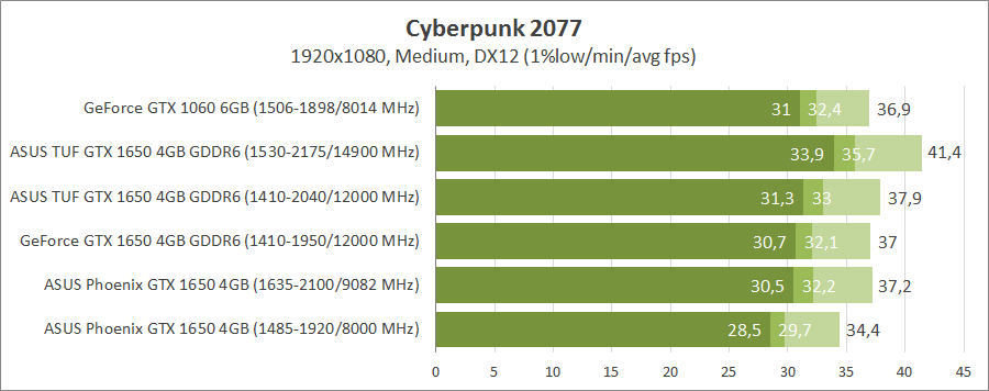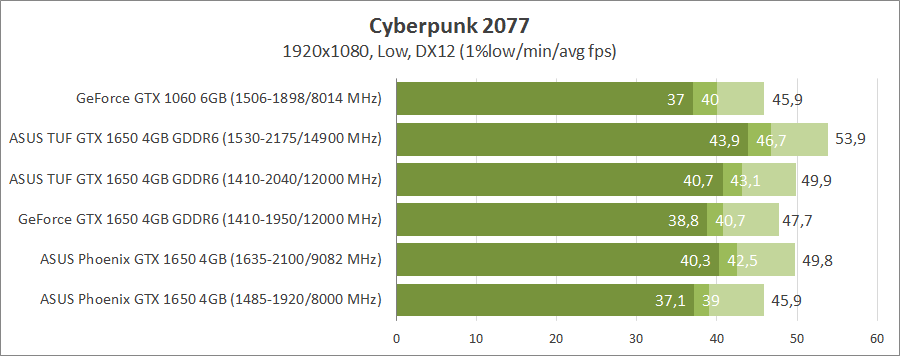При вибраних налаштуваннях (всі параметри на середньому рівні) гідно справляється з грою лише розігнана версія GeForce GTX 1650 GDDR6. ASUS TUF із заводськими частотами поступається GeForce GTX 1060 за мінімальними показниками.