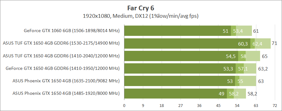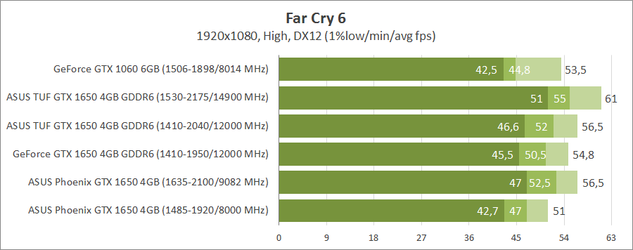 Відеокарти забезпечили хороші результати за високої та середньої якості графіки. Але у першому режимі Far Cry 6 були прогони, коли продуктивність раптово падала до рівня слайд-шоу. Потенціал відеокарт упирається в об'єм відеобуфера, і насправді грати доведеться за середніх налаштувань або нижче. Примітно, що GeForce GTX 1060 показала результати на рівні найпростішої версії GeForce GTX 1650. Перехід від пам'яті GDDR5 до GDDR6 забезпечує підвищення частоти кадрів близько 8%, у поєднанні з високими частотами GPU це дає помітніше прискорення, тому ASUS TUF при заводських частотах обходить суперника на 12%.