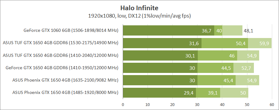 Остання частина Halo виявилася міцним горішком для бюджетних відеокарт. Навіть з низькими налаштуваннями прийнятні результати можна отримати лише на старшій версії GeForce GTX 1650 із розгоном. GeForce GTX 1060 змагається з молодшою версією GeForce GTX 1650.
