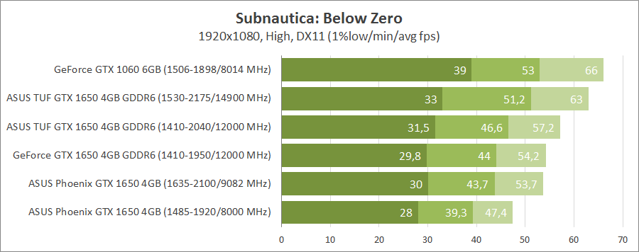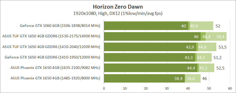 Одна з ігор, де впевнено лідирує GeForce GTX 1060, але найстарша версія GeForce GTX 1650 здатна серйозно мінімізувати розрив шляхом розгону. Різниця між GeForce GTX 1650 із різною пам'яттю 11–14%. Різниця між ASUS TUF та ASUS Phoenix до 18–20%.