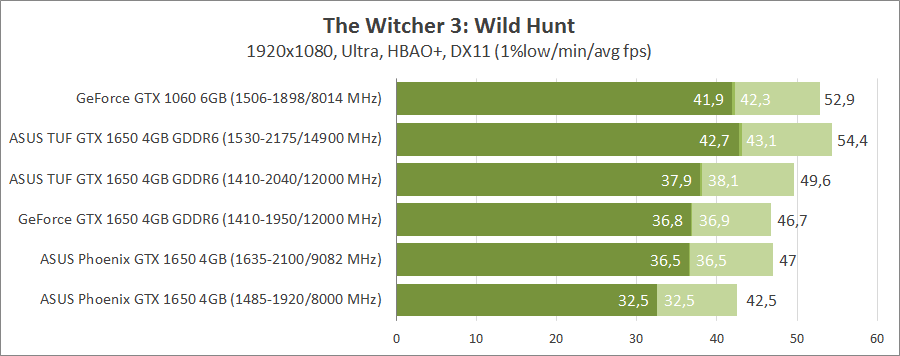 GeForce GTX 1060 GDDR6 справляється з Ultra-графікою з базовими постефектами, з розгоном можна претендувати на максимальні налаштування без HairWorks. У разі молодшої версії GeForce GTX 1650 доведеться знижувати налаштування графіки. ASUS TUF при заводських частотах мінімально поступається GeForce GTX 1060, а з розгоном обганяє старшу карту.