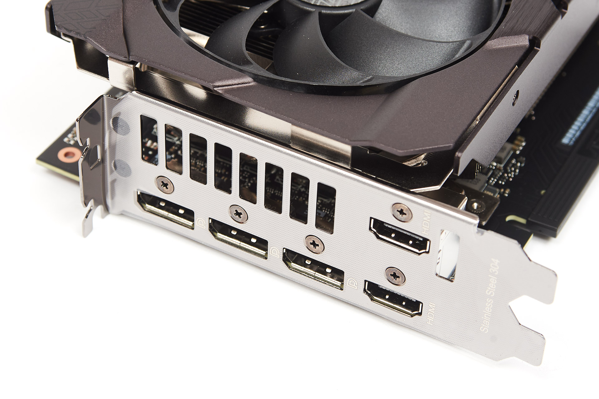 На планці присутні три роз’єми DisplayPort та два HDMI, для виходу гарячого повітря на ній також є прорізи. Карта займає трохи більш як 2,5 слоти.