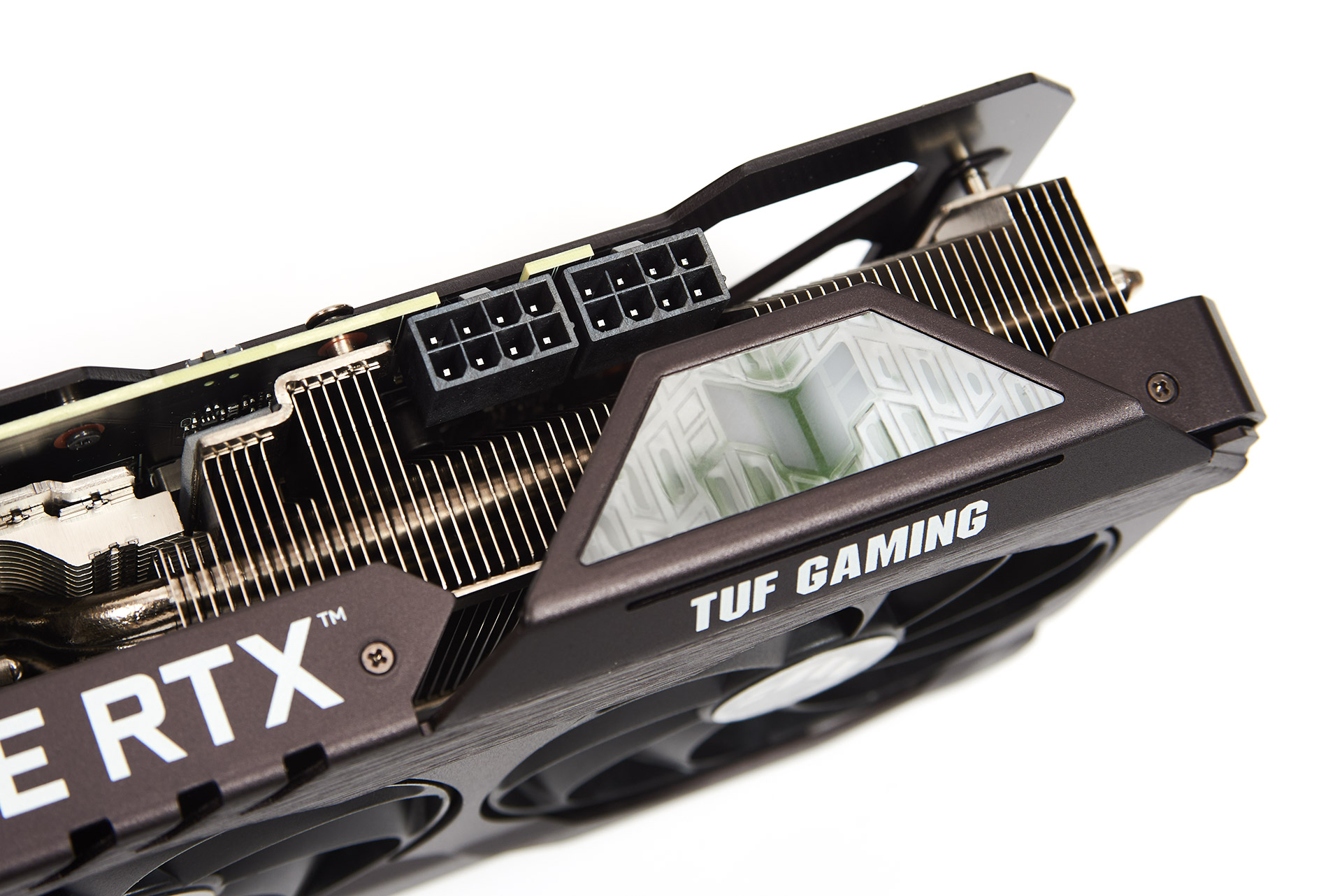На відеокарту встановлено два звичайних 8-контаткних роз’єми живлення, які знаходяться майже в кінці адаптера. Нагадаю, що звичайна TUF GeForce RTX 3060 має лише один роз’єм. Поряд на кожусі є логотип серії TUF з RGB-підсвічуванням.