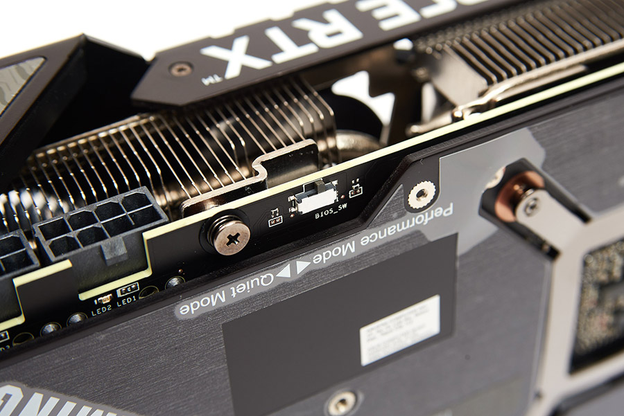 Поруч з роз’ємами з іншого боку знаходиться перемикач BIOS карти, завдяки якому можна обирати продуктивний режим роботи Performance чи тихий Quiet.